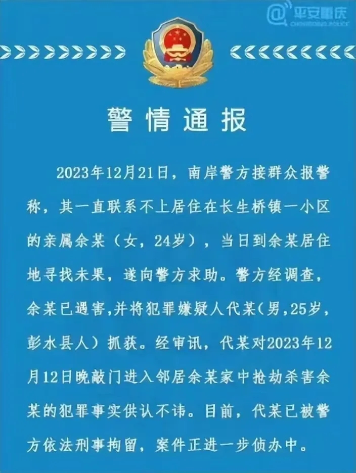 重庆24岁女生被25岁男邻居抢劫杀害,嫌疑人已被刑拘。