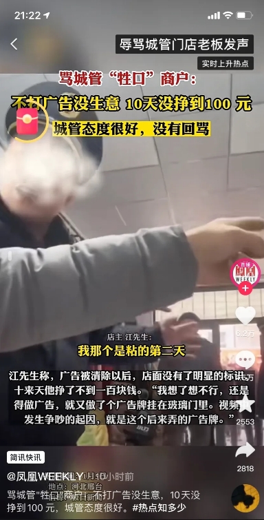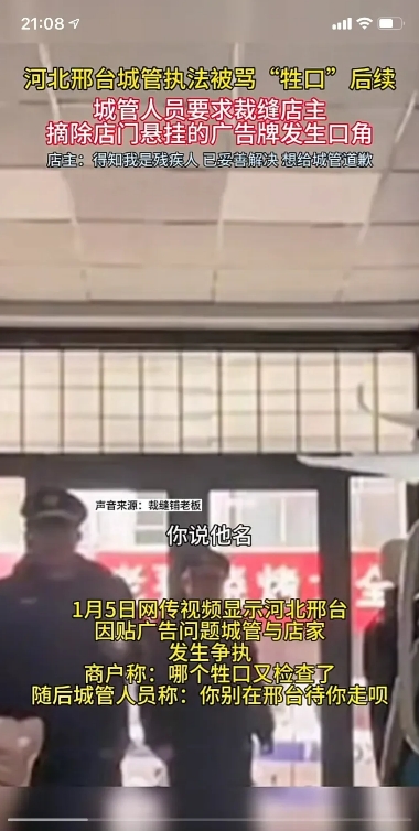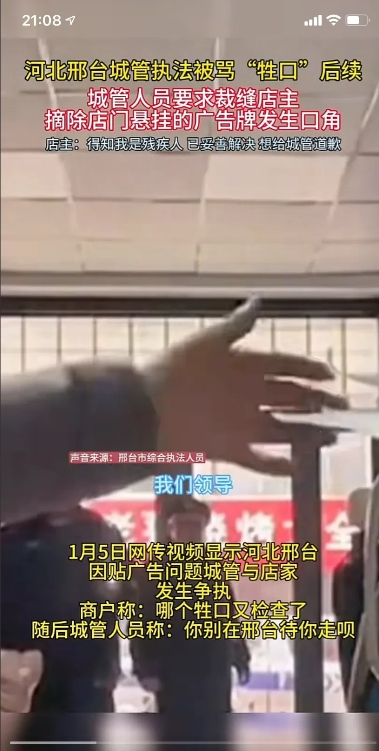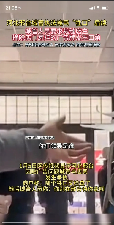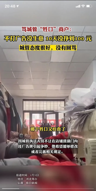 其实在裁缝与城管事件中让我最可笑的是两者之间的对话!裁缝骂“哪个牲口来检查”?城管说了句“我们领导检查”,裁缝说“你们领导是谁”! 最后说一下某些执法实属无厘头,玻璃门不允许不允许有任何广告字、贴画,而透明的玻璃门最容易让人撞上去造成事故,一个玻璃门上有些广告字宣传一下店影响什么市容市貌了,古代建筑有雕镂、刻画,有些地方贴窗花,也称得上艺术美! 裁缝的言语也过激了,不过我想是在极度无助的情况下才口吐此言吧! 市容管理确实是老大难问题,但还是要做到人性化,而且有法可依、有据可查,让经营者和商户信服!