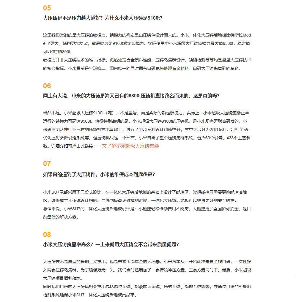 小米终于绷不住,针对近日以来的各种谣言,小米汽车整理了网友100个问题准备分三期进行解答,接下来我就带大家看看第一期有什么值得关注的问题被解答了。 首先就是大家最关注的价格,毕竟小米产品一向主打高性价比,因此小米汽车的售价自然会是让大家最为关注的,通过小米汽车技术发布会,我们对小米SU7的外观、性能都有了一定的了解,一款外观媲美保时捷911,智能体验不逊于特斯拉的新能源汽车,如果真的只定价9.9万,你真的敢买吗?毕竟一分钱一分货才是硬道理。我相信即使小米SU7的起售价来到25万,在同价位的新能源汽车中也会是超高性价比的存在,不信我们就拭目以待! 其次大家关注的一定是大压铸的相关问题,小米自研的整个压铸集群系统是生产的流水线,而不是自己去自研压铸机,小米是用精准的控制对汽车部件的冲击力进行控制,而大家关心的大压铸件的成本问题,小碰撞不会产生多少费用,大碰撞时能够确保你的安全,毕竟生命是无价的。 最后就是小米电池到底如何,CTB倒置技术让其获得了全球最严苛的热失控安全标准;行业顶级的17层高压绝缘防护,让其可以忍受1000℃的高温;热管理又能够保证其在低温时安然无恙,所以说小米电池不仅续航优秀,恶劣环境对它的影响也是不大。 另外,首批的问答中还包含了小米SU7名字的由来、后续会不会推出红米汽车以及雷总后面是不是就聚焦造车了?还有精力造好手机么?等网友关心的问题,大家有兴趣的可以关注一波哦!#小米汽车100问#