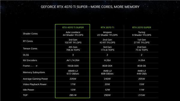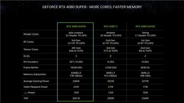 NVIDIA正式发布了RTX 40 SUPER系列升级版显卡,包括RTX 4070 SUPER、RTX 4070 Ti SUPER和RTX 4080 SUPER。新显卡将在本月中下旬陆续上市,首发品牌包括:华硕、七彩虹、耕升、影驰、技嘉、映众、微星、索泰、万丽、翔升、铭瑄、盈通。新卡发布后,RTX 4080、RTX 4070 Ti将立即退市,RTX 4070则继续销售。 先来看看【RTX 4070 SUPER】的特性吧: 1,核心芯片还是AD104,编号从RTX 4070 AD104-250变为AD104-350; 2,CUDA核心数量从5888个增加到7168个,是三款型号中增加数量最多的; 3,核心基准频率小幅增加60MHz而来到1980MHz,加速频率则维持在2475MHz。显存完全不变,仍然是192-bit 12GB GDDR6X,等效频率21GHz,带宽504GB/s。整卡功耗从200W提高到220W; 4,官方宣称,RTX 4070 SUPER只用了RTX 3090的一小部分功耗,就实现了超越RTX 3090的性能,结合DLSS 3,性能领先优势将达到1.5倍。它的价格为4899元起(涨价是因为汇率变化,美元价格不变)。 接下来是【RTX 4070 Ti SUPER】: 1,NVIDIA历史上第一次Ti、SUPER出现在同一款产品上,核心编号从RTX 4070 Ti AD104-400变为AD103-275,核心芯片换了; 2,CUDA核心数量从7680个增加到8448个,核心频率增加到2340MHz。功耗不变还是285W; 3,显存是变化最大的,192-bit 12GB GDDR6X增加到256-bit 16GB GDDR6X,频率还是21GHz,带宽因此大幅扩充到672GB/s; 4,主要面向2K甚至是4K游戏,官方说性能相比RTX 3070 Ti快了多达1.6 倍,开启DLSS 3后可以领先2.5倍。价格6499元起,和RTX 4070 Ti首发价完全相同。 最后是【RTX 4080 SUPER】: 1,核心编号从RTX 4080 AD103-300 变为AD103-400,CUDA核心数量从9728个增加到10240个; 2,频率方面,基准、加速分别增加到2295MHz、2550MHz。 3,显存方面,256-bit 16GB GDDR6X的位宽、容量不变,但是等效频率从22.4GHz提高到23GHz,甚至高于RTX 4090 21GHz,带宽达到736GB/s; 4,算力高达52 Shader TFLOPS、121 RT TFLOPS、836 AI TOPS。功耗不变,还是320W; 5,适合4K光追游戏,性能相比RTX 3080 Ti快了1.4倍,开启帧生成、DLSS 3技术后可以领先2倍。价格8099元起,相比RTX 4080便宜了不少。