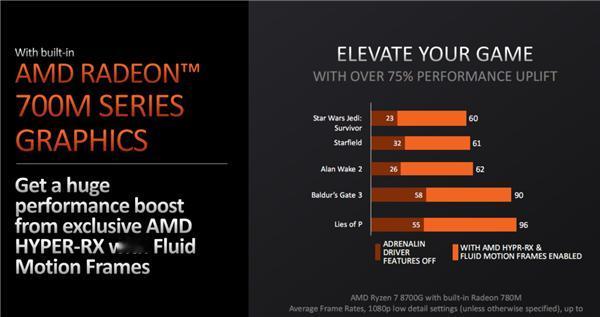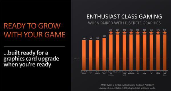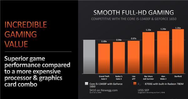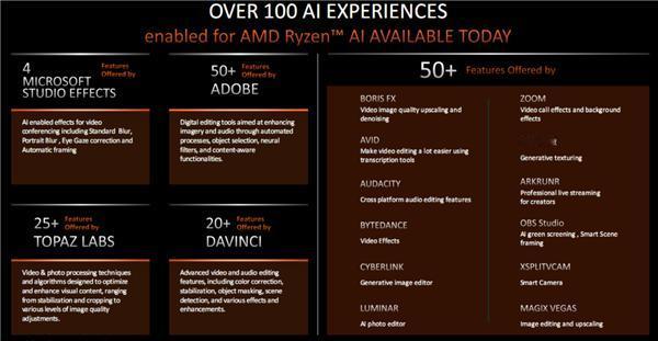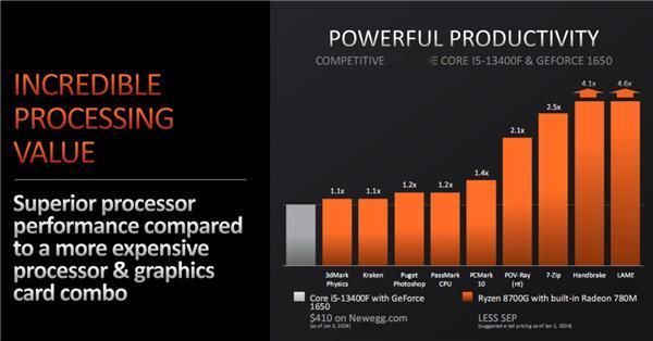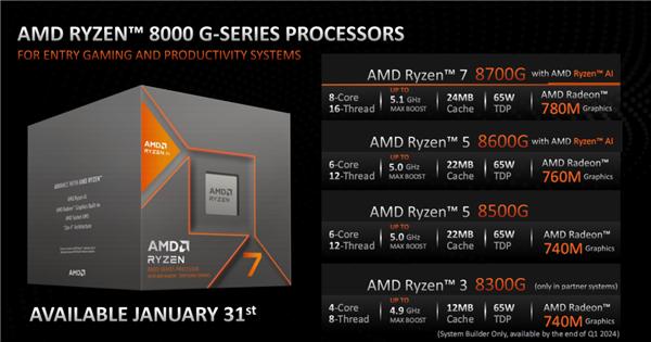 AMD推出了桌面级锐龙8000G APU,这是AMD推出的第五代桌面锐龙APU,它的主要特点如下: 1,采用4nm工艺打造,Zen4 CPU架构,RDNA3 GPU架构,AM5封装接口,支持DDR5内存,PCIe 5.0通道; 2,兼容AMD 600系列主板,包括X670、B650、A620; 3,最高端的型号为锐龙7 8700G,它拥有8核心16线程、8MB二级缓存、16MB三级缓存,主频4.2-5.1GHz,集成Radeon 780M GPU核显,12个CU单元,频率高达2.9GHz创下新纪录,同时集成锐龙AI引擎; 4,性能很强大:锐龙7 8700G无需独立显卡,就要比i5-13400F搭配GTX 1650更加便宜,CPU基准性能更好,有些项目领先10-20%,LAME分值甚至达到了4.6倍。GPU游戏性能互有胜负,部分项目还大幅领先(要考虑到,这是核心显卡对独立显卡); 5,Radeon 780M核显游戏性能,1080p低画质下可以在众多3A大作中获得60+的帧率,网游可以轻松超过100FPS,LOL可高达236FPS,《坦克世界enCore》甚至能飙到581FPS; 6,Radeon 700M核显支持光追、FSR,还支持HYPR-RX加速、帧生成技术,开启后平均可获得75%的性能提升,大型游戏也能稳定流畅; 7,锐龙8000G系列是首款具备独立AI引擎的桌面处理,加上强大的CPU、GPU,锐龙8000G的整体算力最高达到了39TOPS; 8,目前AMD AI技术已经支持150多项软件功能,其中Adobe系列就有超过50项; 9,锐龙8000G APU将在1月31日上市,但初期仅限系统整机,今年Q1末期在零售市场上市。