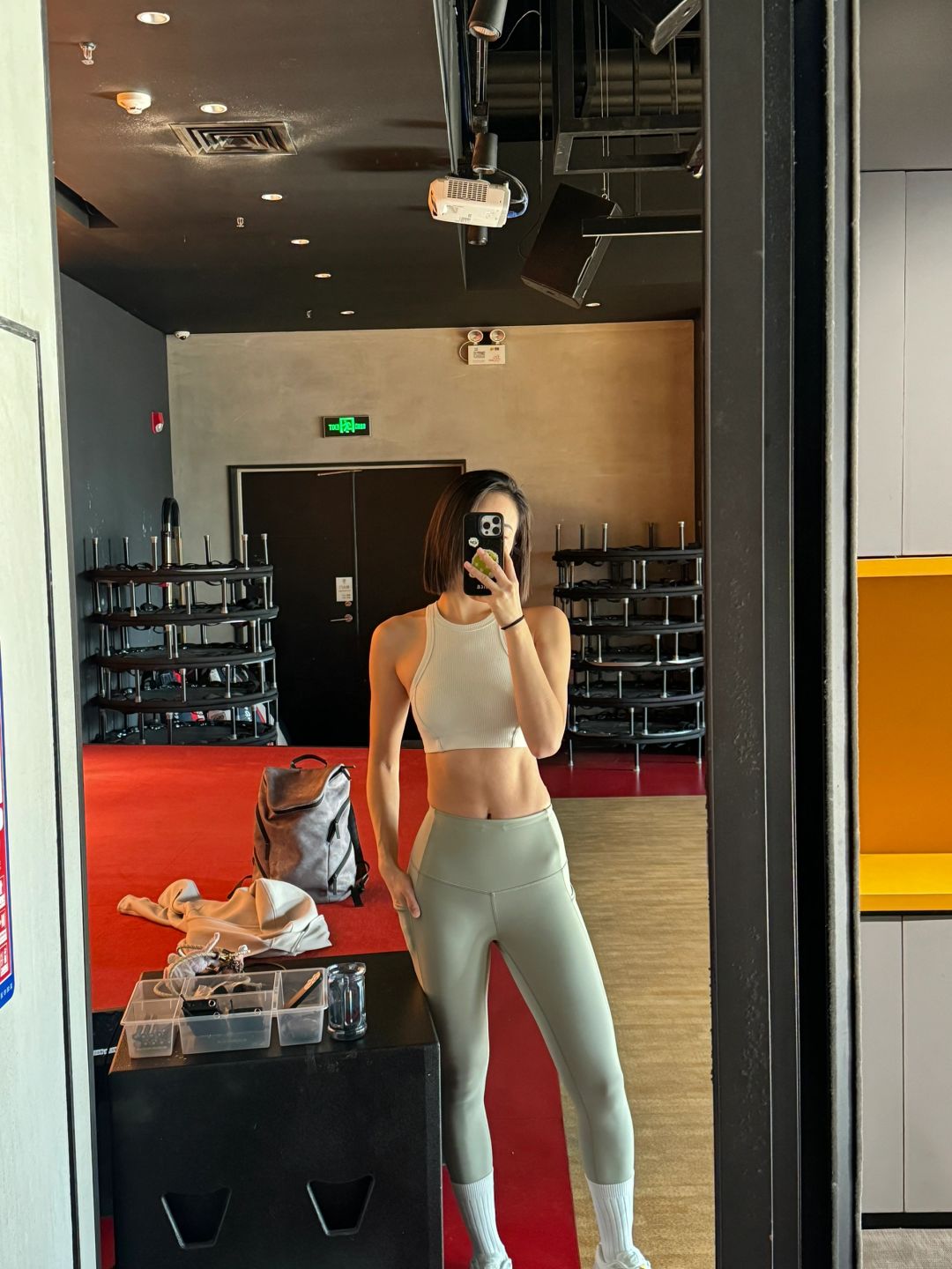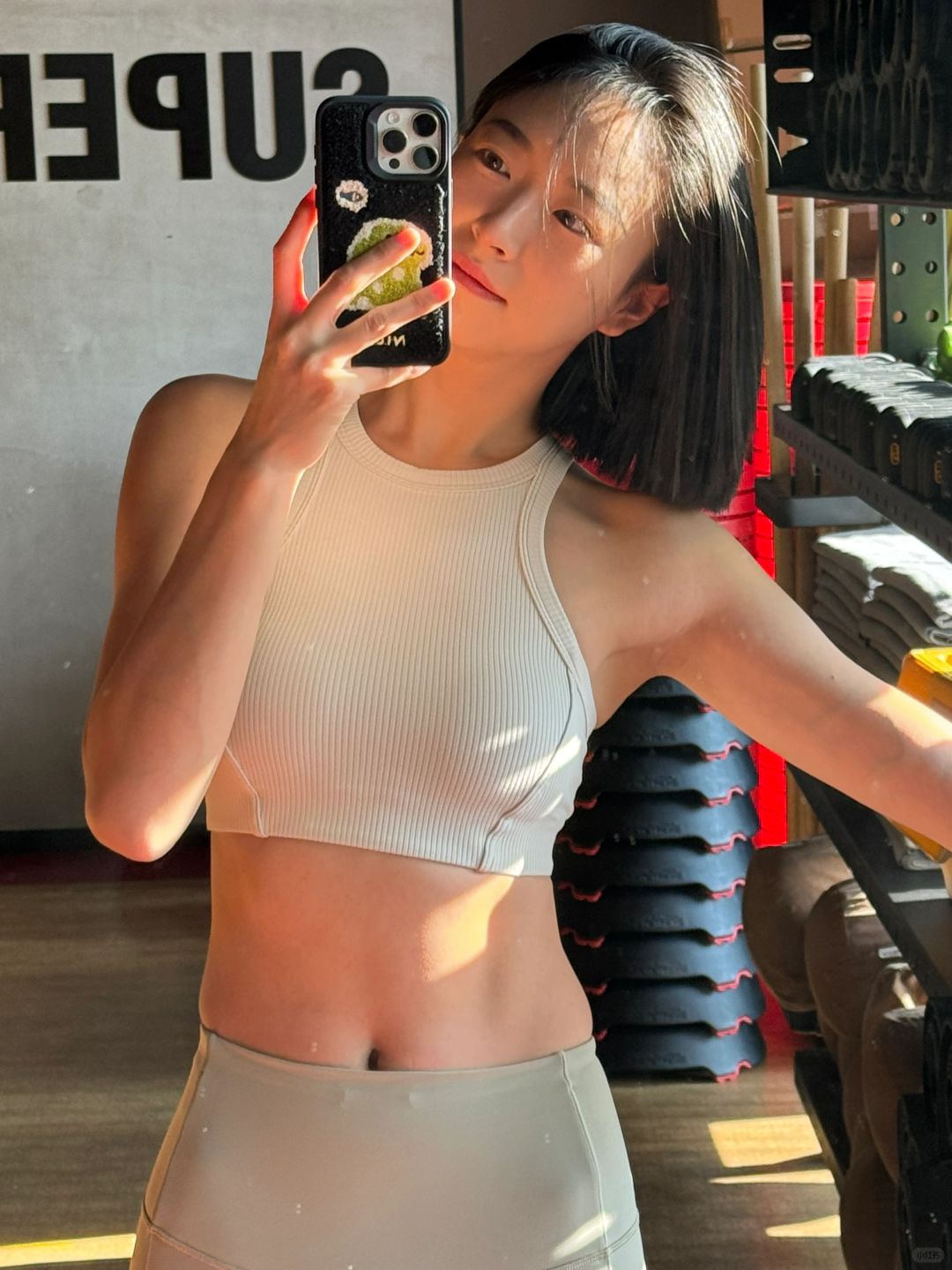 浅草绿色搭米白色真的很好看 裤子我很爱 剪裁和版型都很利落 因为是高强度训练裤 所以臀腿腰腹这块可以收的很好👌🏼 上衣不说了 23年热门款 同一个款式 我买了三个颜色 高领 挖肩 不压胸👍🏼 👚lululemon 👖
