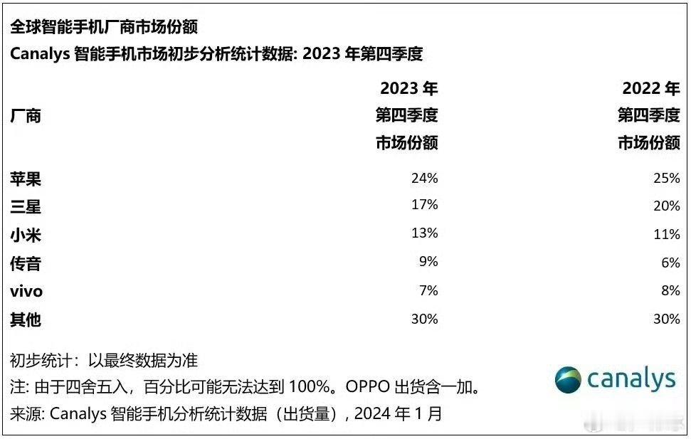 全球手机份额苹果三星小米前三,比较令人意外的是传音排在第四,比vivo还高2%