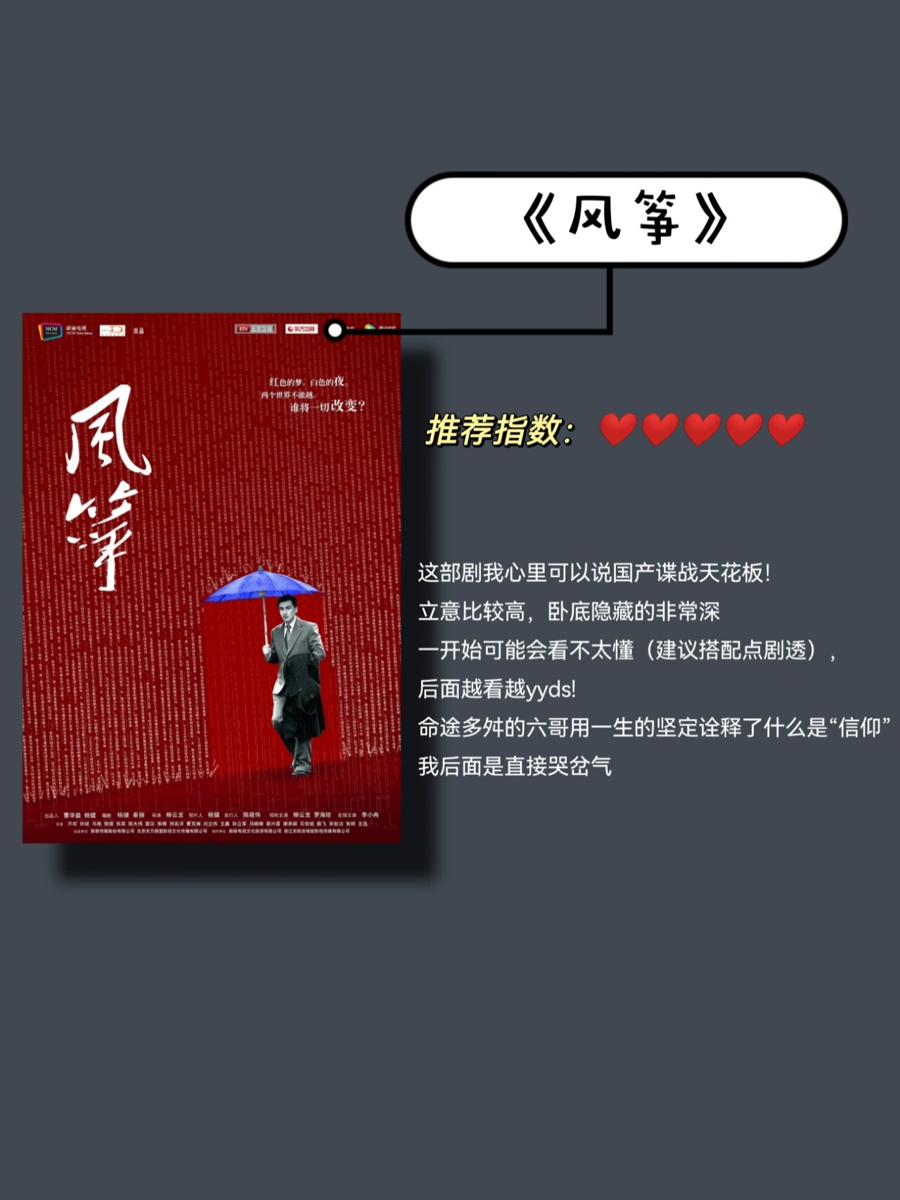 这部剧我心里可以说国产谍战天花板!立意比较高,卧底隐藏的非常深,一开始可能会看不太懂(建议搭配点剧透),后面越看越yyds! 命途多舛的六哥用一生的坚定诠释了什么是“信仰”,后面直接给我哭岔气~
