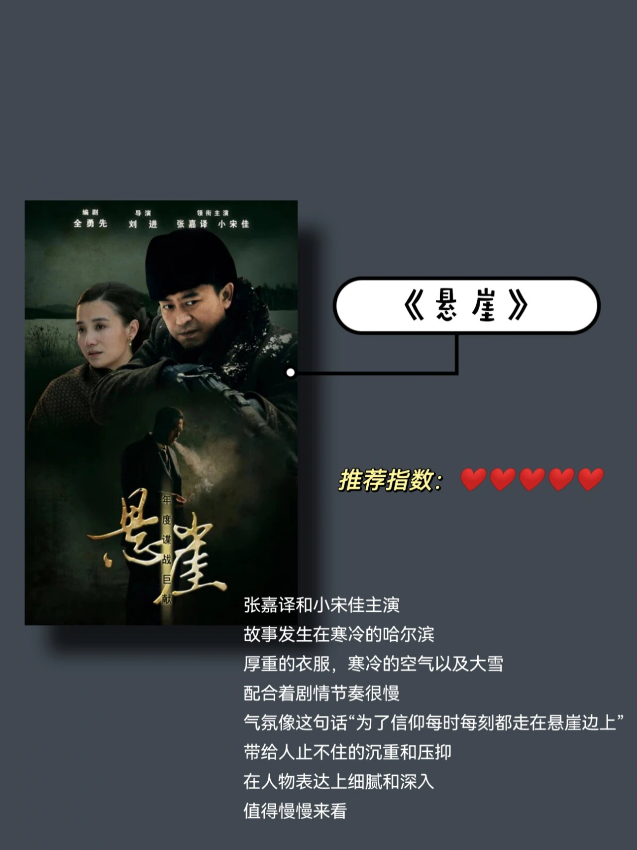张嘉译和小宋佳主演,故事发生在寒冷的哈尔滨,厚重的衣服,寒冷的空气以及大雪,配合着剧情节奏很慢,气氛很像这句话“为了信仰每时每刻都走在悬崖边上”带给人一种,沉重感和压抑感。在人物表达上细腻和深入,值得慢慢来看。