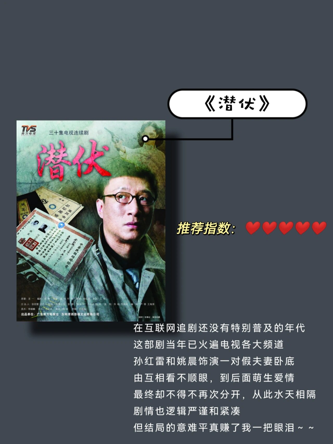 在互联网追剧还没有特别普及的年代,这部剧当年已火遍电视各大频道。孙红雷和姚晨饰演一对假夫妻卧底,由互相看不顺眼,到后面萌生爱情,最终却不得不再次分开,从此水天相隔。剧情也逻辑严谨和紧凑,但结局的意难平真赚了我一把眼泪