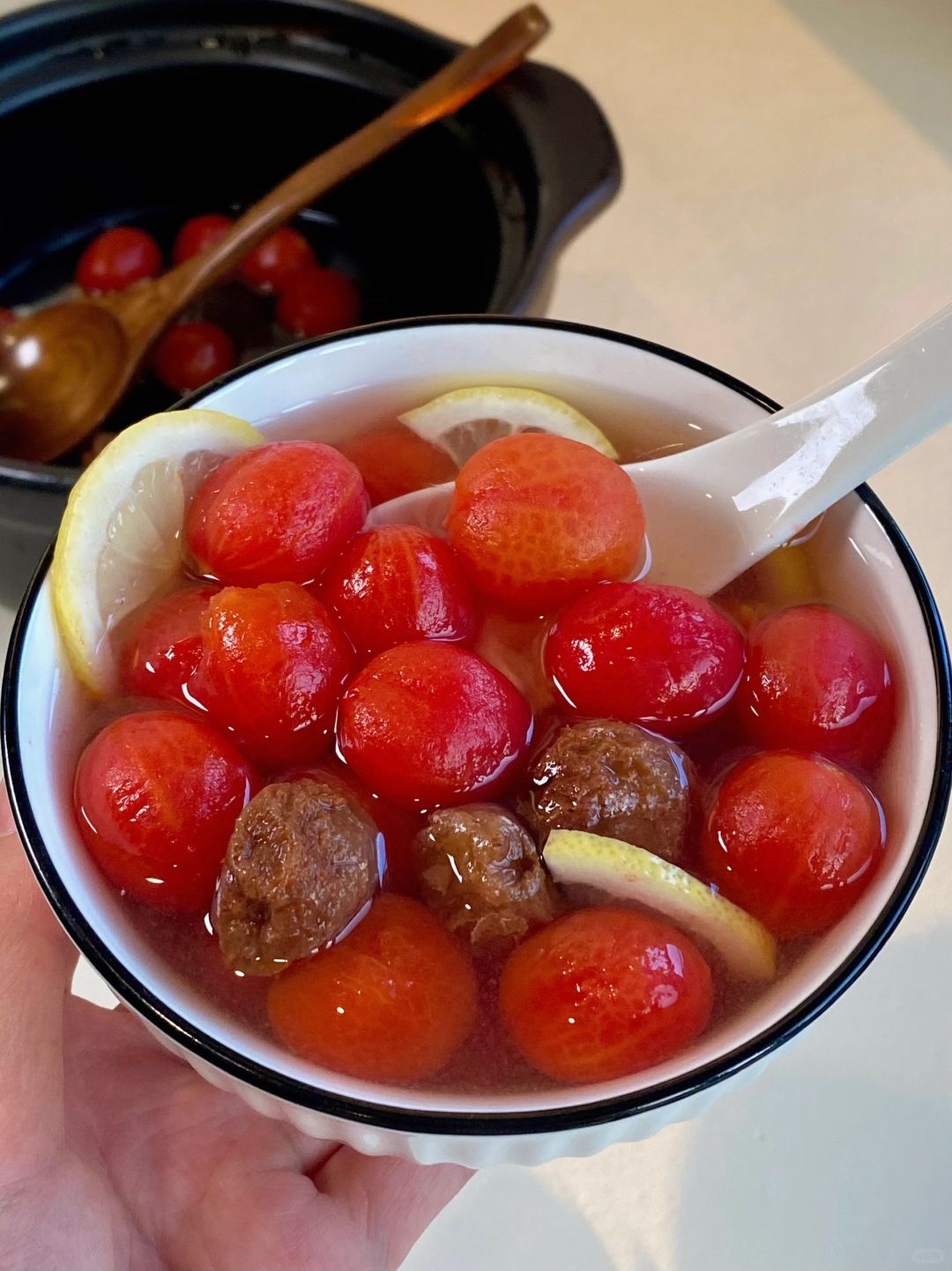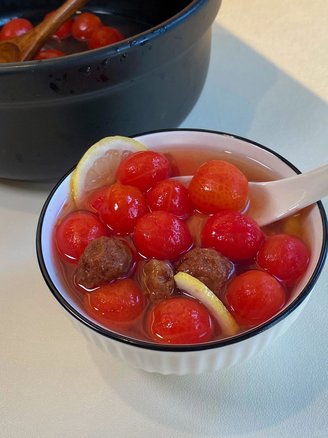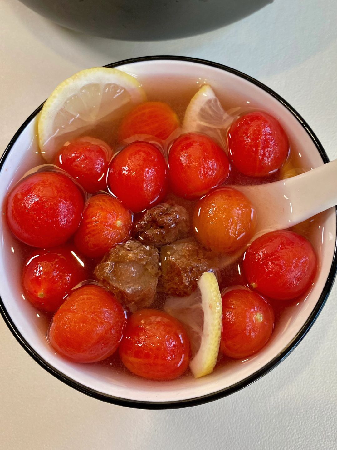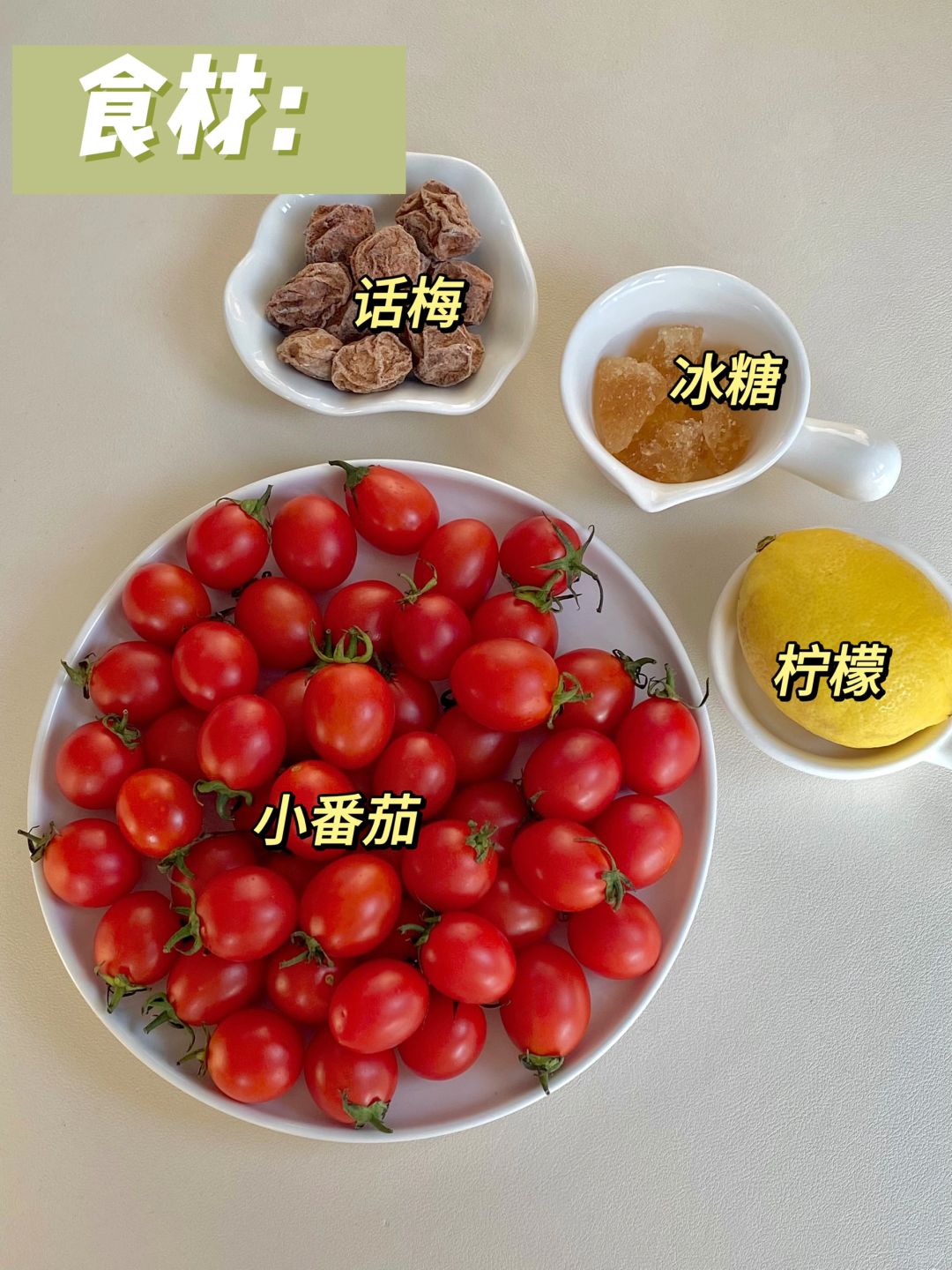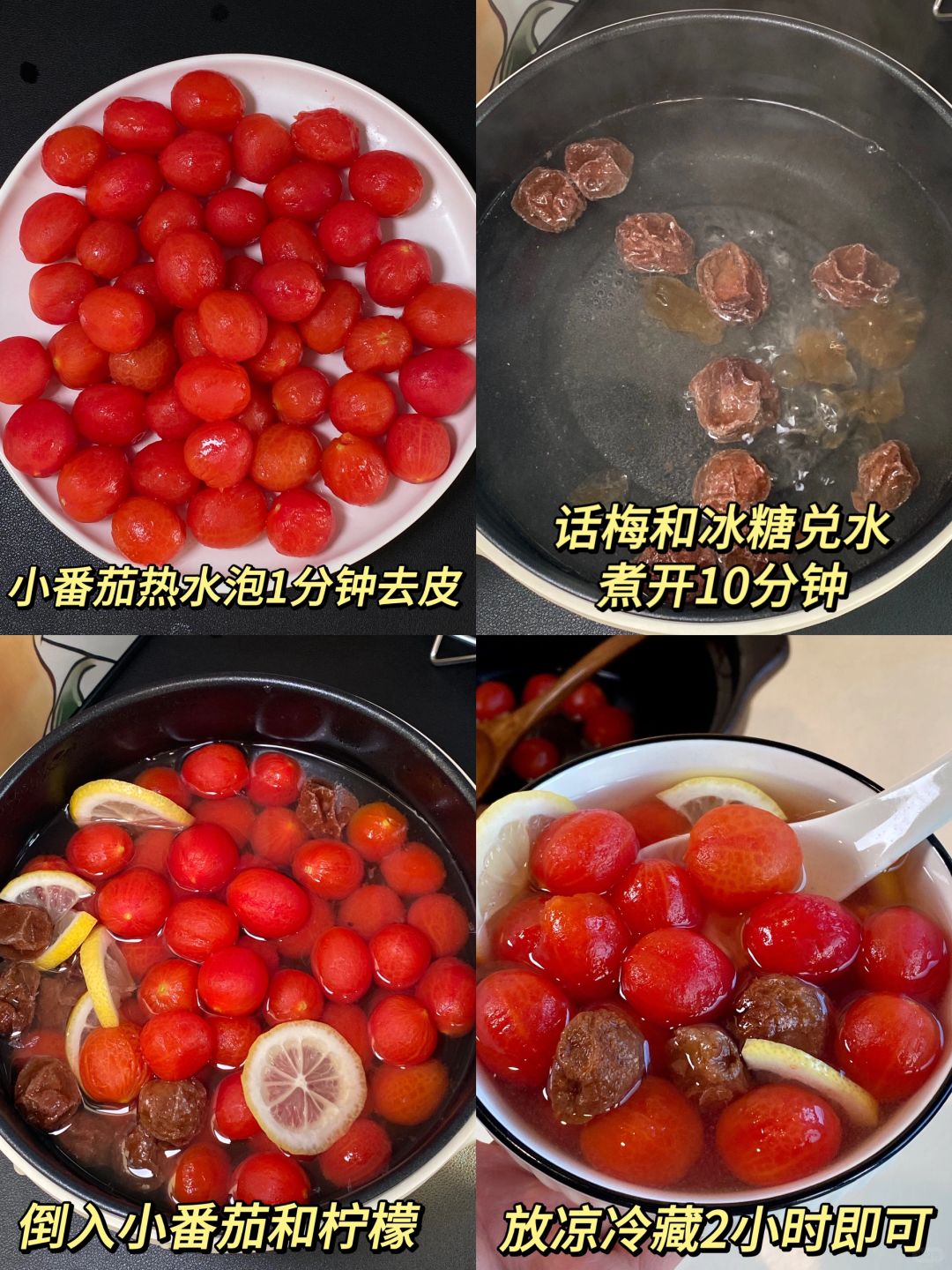 梅渍小番茄!口感真的惊艳啦!![黄金薯R] 年夜饭桌上一定要有它!酸酸甜甜的贼清爽!! 一口爆汁!!还带着话梅的咸香!! 真的巨巨巨巨解腻~贼好吃😋 📝小番茄、话梅、冰糖、柠檬 🥣做法: 1⃣️小番茄热水泡1分钟好去皮 2⃣️话梅冰糖兑水煮开10分钟 3⃣️倒入小番茄和柠檬片搅拌一下,放凉冷藏2小时即可 大鱼大肉后来上一碗!巨清爽解腻!! 自己做!真的简单!清爽酸甜老开胃了👍