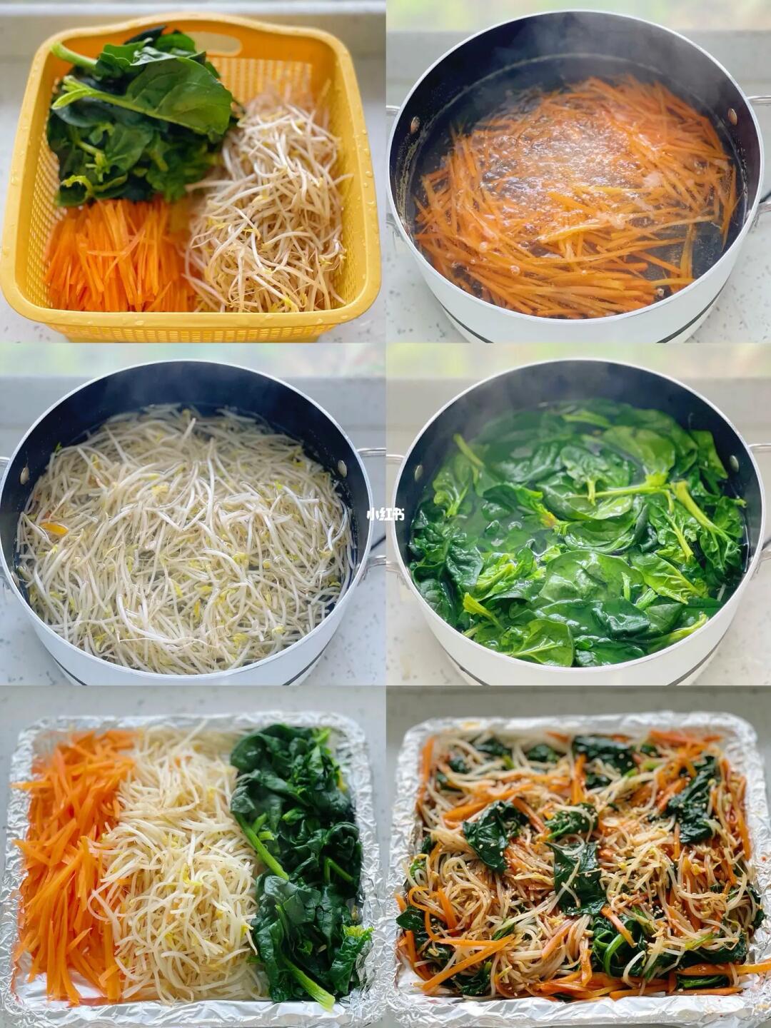1️⃣胡萝卜、豆芽、菠菜分别烫熟放凉