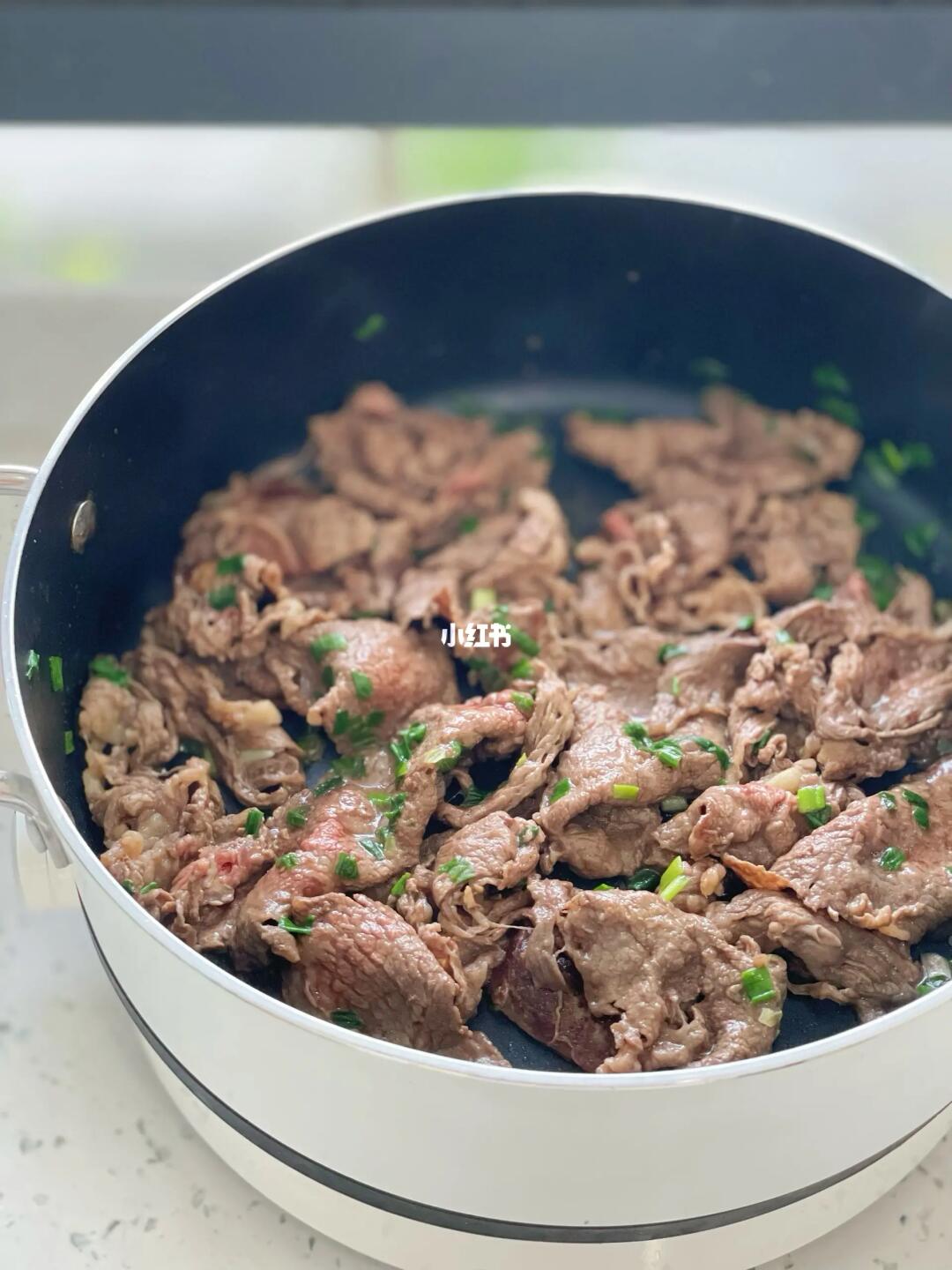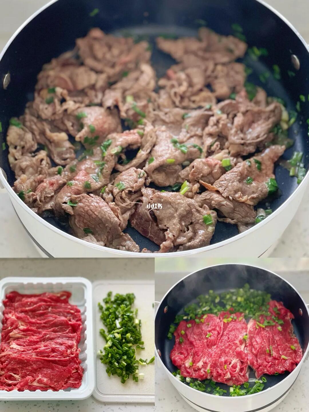 2️⃣锅里热油把牛肉、盐葱一起放入