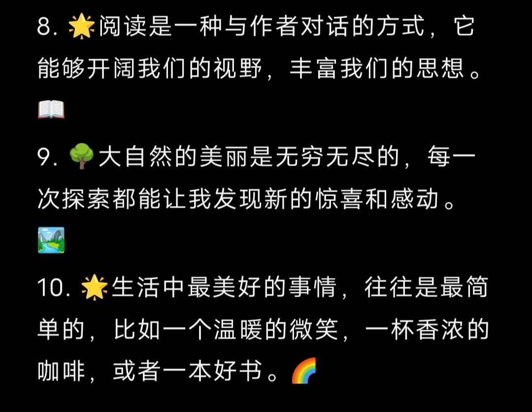 10. 🌟生活中最美好的事情,往往是最简单的,比如一个温暖的微笑,一杯香浓的咖啡,或者一本好书。🌈