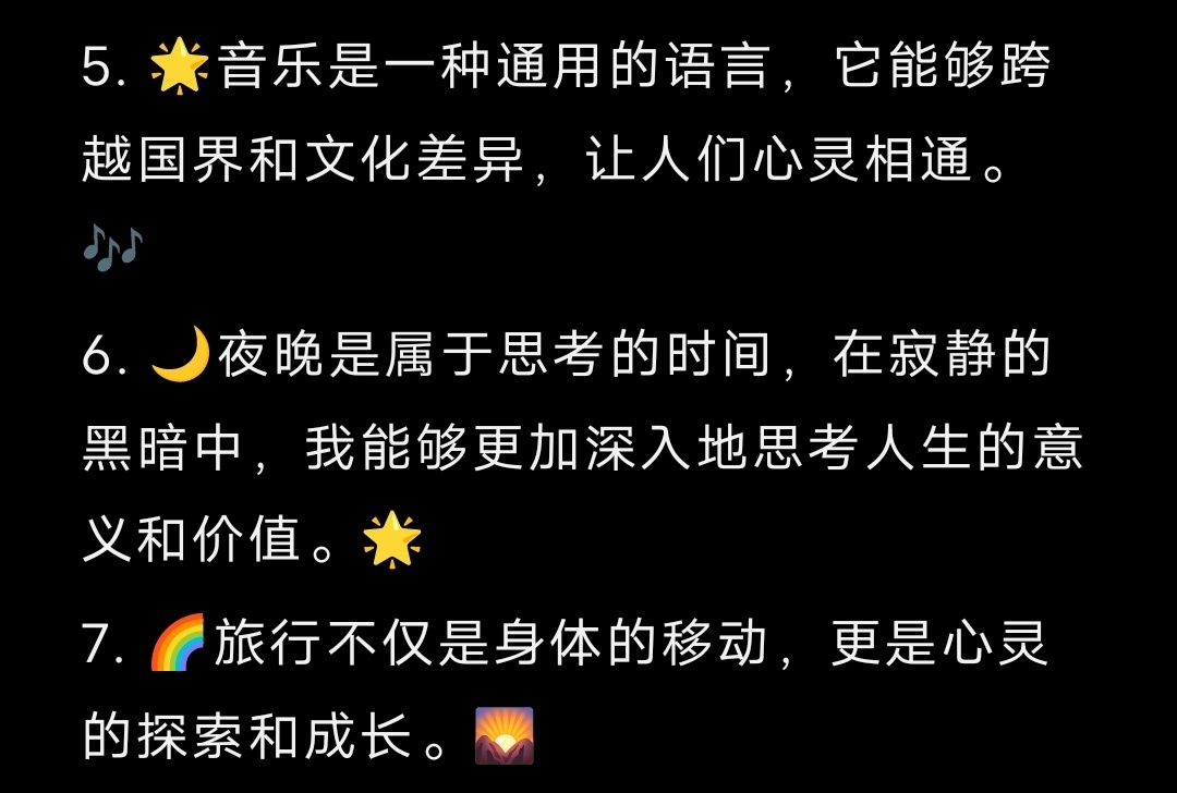 6. 🌙夜晚是属于思考的时间,在寂静的黑暗中,我能够更加深入地思考人生的意义和价值。🌟