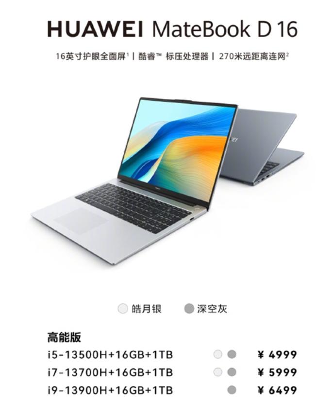 华为MateBookD16高能版今天正式开售,i5-13500H、i7-13