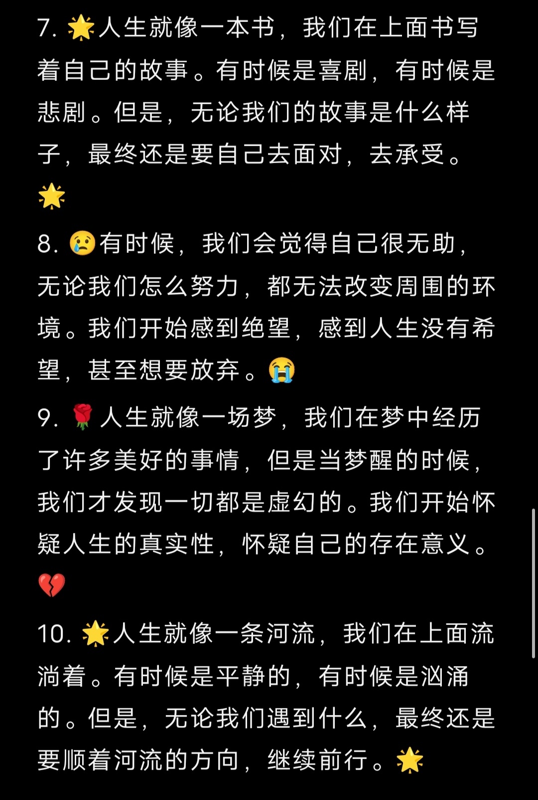 10. 🌟人生就像一条河流,我们在上面流淌着。有时候是平静的,有时候是汹涌的。但是,无论我们遇到什么,最终还是要顺着河流的方向,继续前行。🌟