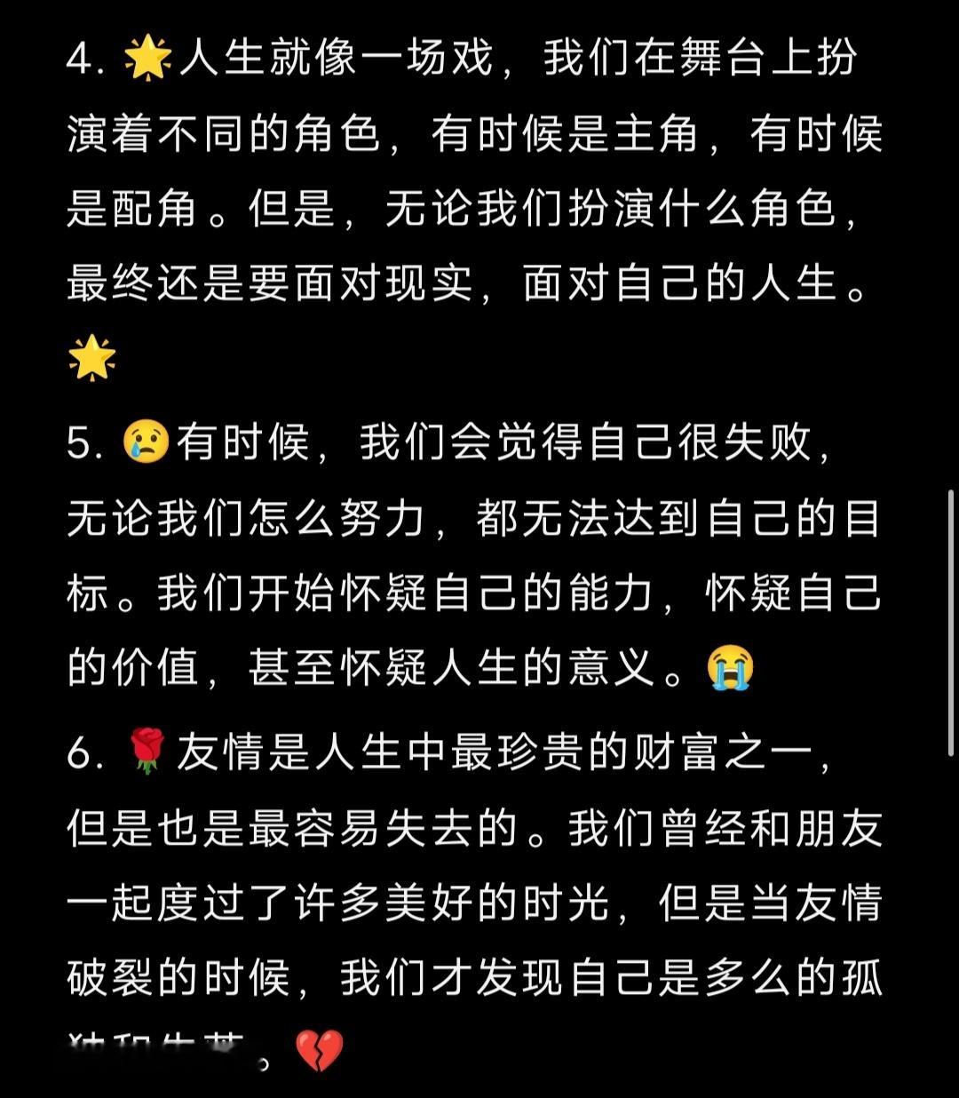 4. 🌟人生就像一场戏,我们在舞台上扮演着不同的角色,有时候是主角,有时候是配角。但是,无论我们扮演什么角色,最终还是要面对现实,面对自己的人生。🌟