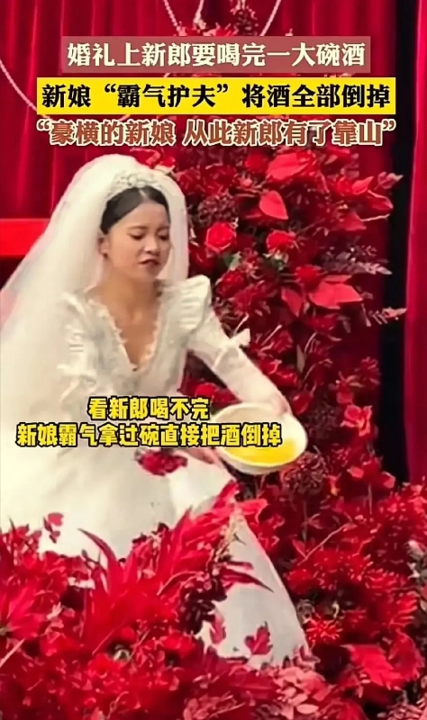 这个新娘太霸气了!四川,婚礼上长辈故意刁难新郎,给他倒了一大碗的酒要求新郎干掉!新郎当着大家的面不好意思不给长辈面子,于是硬着头皮去喝。但万万没想到,新娘霸气护夫,夺过碗将酒倒在了地上!网友:新娘虽然是爱新郎,但倒酒不吉利没教养!