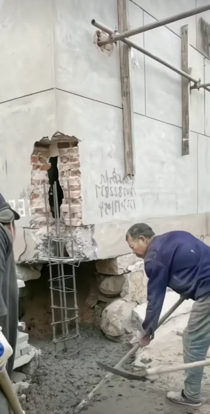 房屋一角下沉的厉害,请人刨开后,挖了个8米深的桩孔,浇了个钢筋混凝土桩,桩上面顶