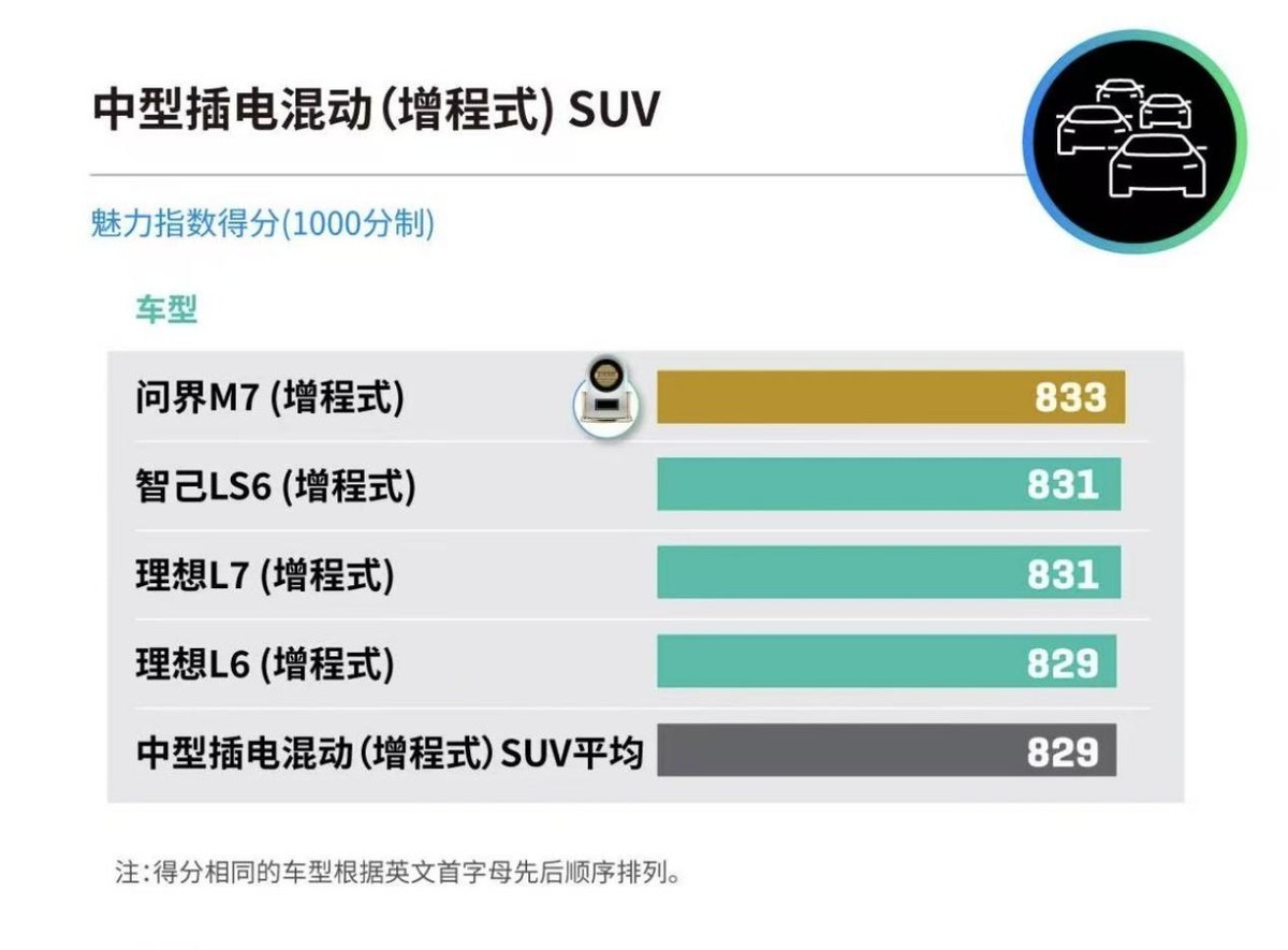 权威奖项的认可,往往是产品实力的最佳注脚。近日,全球领先的消费者洞察与市场研究机构J.D. Power(君迪)发布2026中国新能源汽车产品魅力指数研究报告。在这份基于大量真实车主(购车2-6个月)用车体验的权威榜单中,问界M7以833分(1000分制)的高分,一举摘得“中型插电混动(增程式)SUV”魅力指数第一名。