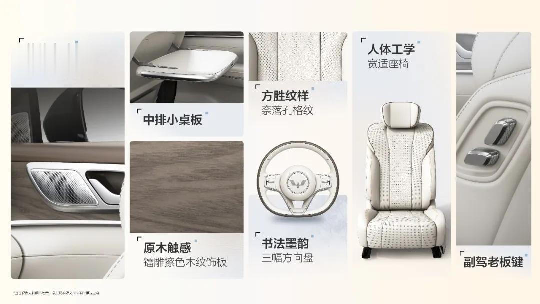细节之处更见高级感:方向盘融入书法墨韵灵感,木纹饰板镭雕擦色工艺打造原木触感,真金属扬声器罩打孔暗合古韵旋律,奈落孔格纹采用方胜纹样,处处彰显低调中的品质。整车搭载8.8英寸仪表屏+15.6英寸中控屏,操作流畅、交互直观;配备256色全色域呼吸氛围灯,支持固定/随机/驾驶三种模式,出行仪式感十足。更有贴心实用的配置——副驾老板键,二排乘客可一键调节副驾,大幅拓展腿部空间;二排小桌板,兼顾办公与娱乐等场景。