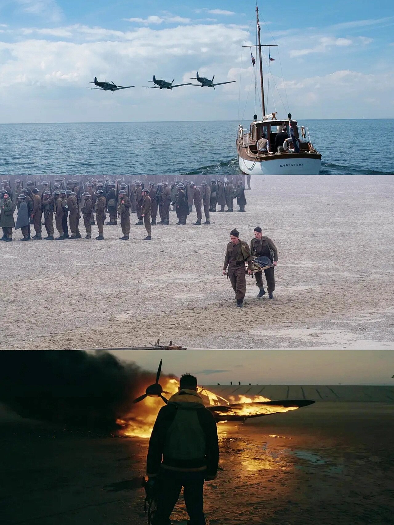 📍电影从陆、海、空三个场景以及相对应的一周、一天、一小时的时间拍摄,为了营造战争的紧迫感,诺兰再次打破常规,采用非线性叙事风格,并将对白的数量压缩到最低。被困于敦刻尔克海滩上的士兵们唯一的心愿就只有回家,明明家就在对岸,却像隔了千山万水,连回家也成了奢望。
