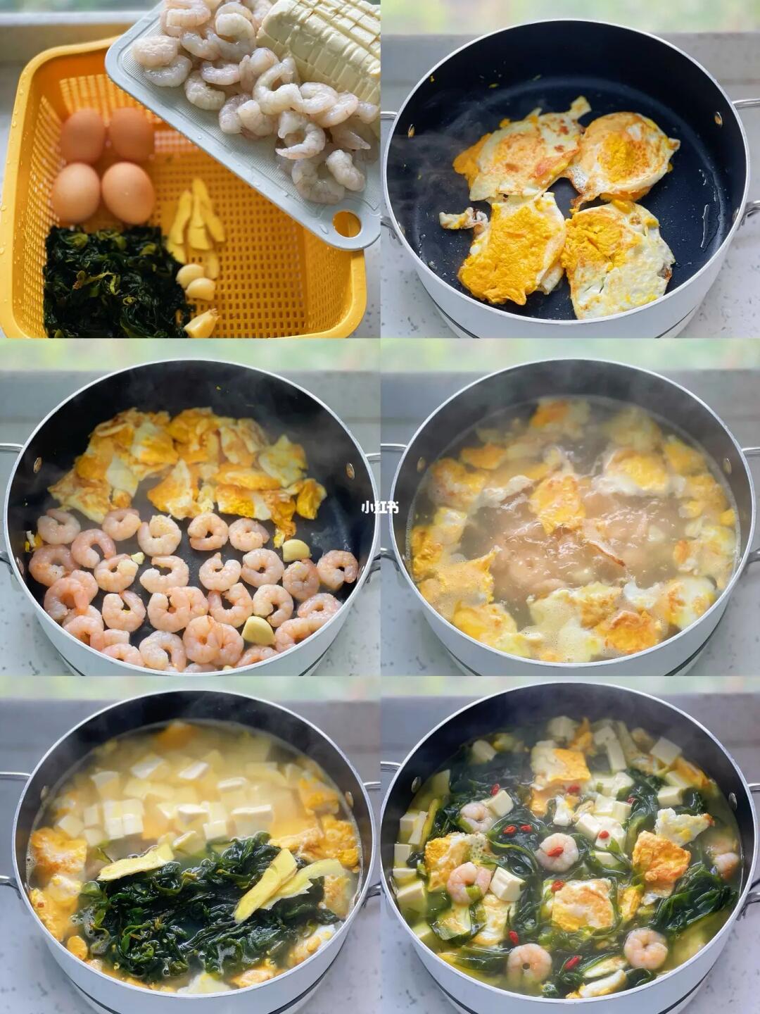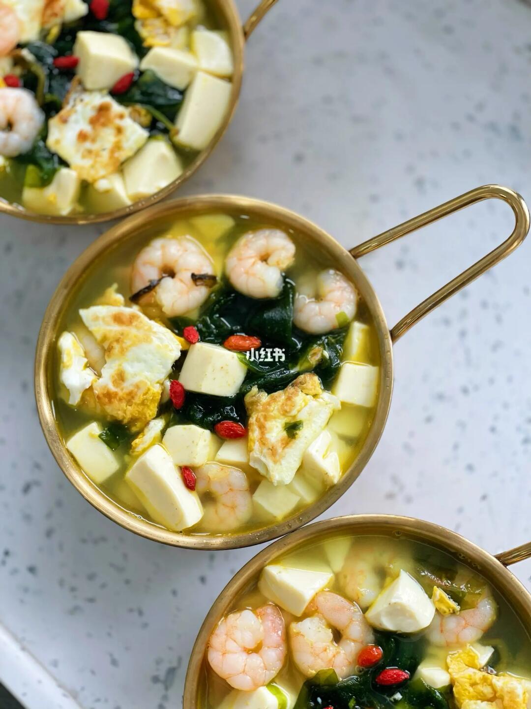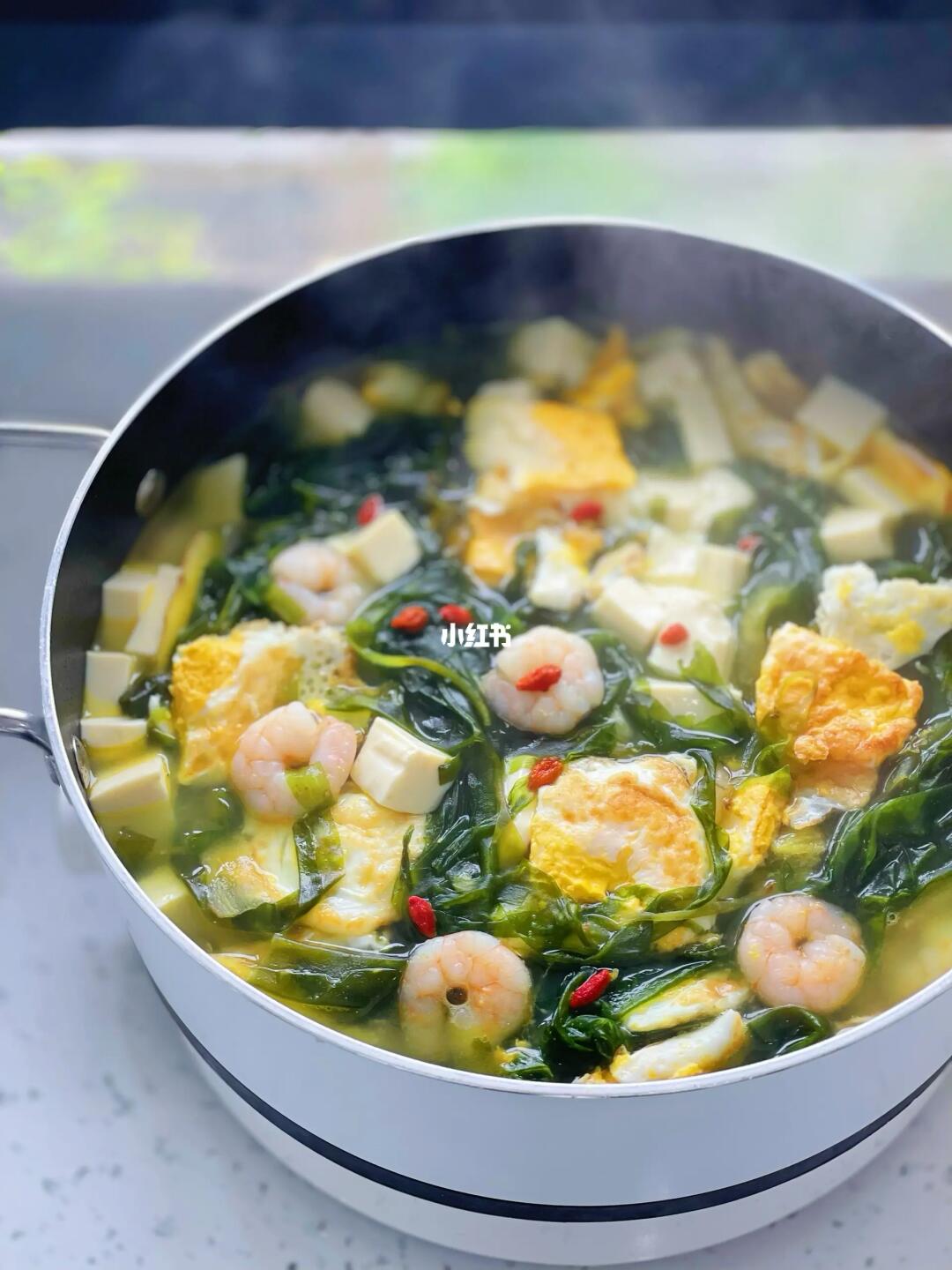 🌟裙带菜虾仁豆腐汤 裙带菜|虾仁|豆腐|鸡蛋|姜|蒜|枸杞|盐 1️⃣锅里用少量油把鸡蛋煎熟切块,蒜炒香虾仁炒熟。加入清水没过食材煮沸 2️⃣加入豆腐、提前泡发的裙带菜、姜片,盖锅盖再次煮开。转小火煮3-5分钟 3️⃣盐调味,撒上枸杞即可出锅 ❤️做法很简单,营养全面的汤。特别适合减脂期想吃清淡的姐妹。