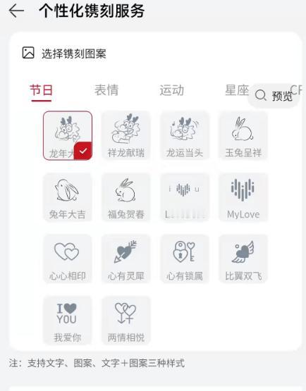 华为商城龙年镌刻图案正式上线,购买耳机、平板、Tag防丢精灵等产品,即可进入个性