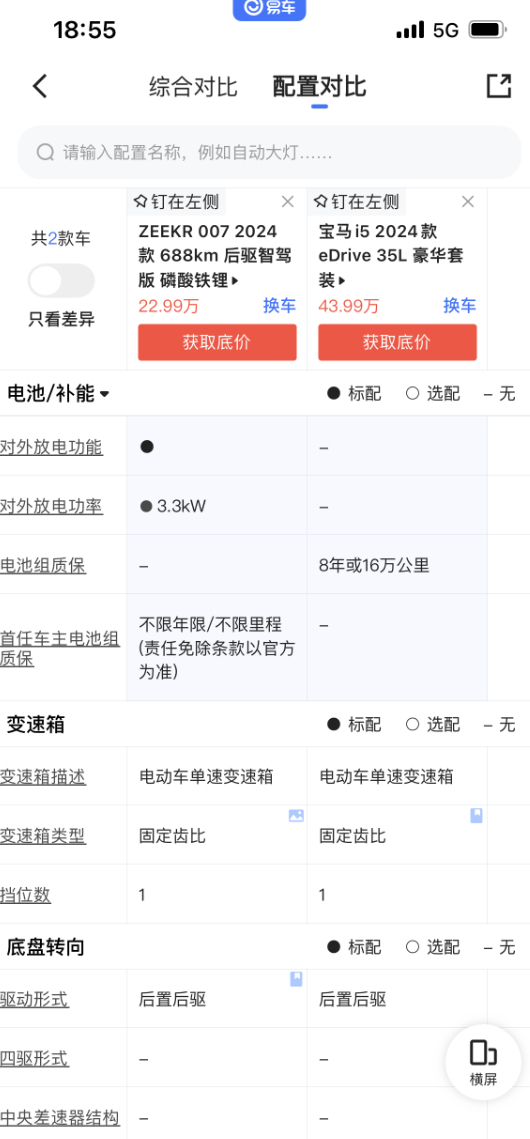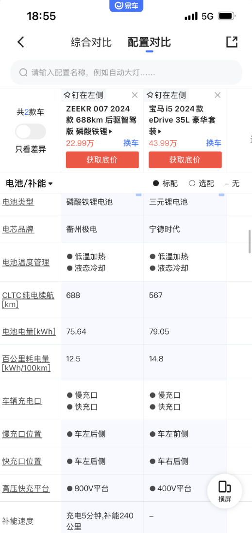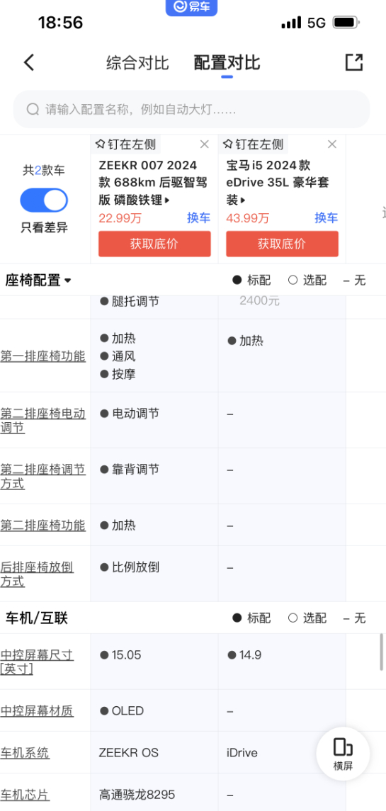 宝马i5起步40多万的车了,这配置要啥没啥,除了标之外,无论外观还是配置都远不如极氪007,400V,没有座椅通风加热567的续航,6.7的破百时间,2.2的自重配个单电机,其他的大家看配置表吧,对了007配的是8295,i5搭配的是8155。这车你会买么?要我有四十多万的话,一台极氪007,一台小米SU7,公司家里各一台。