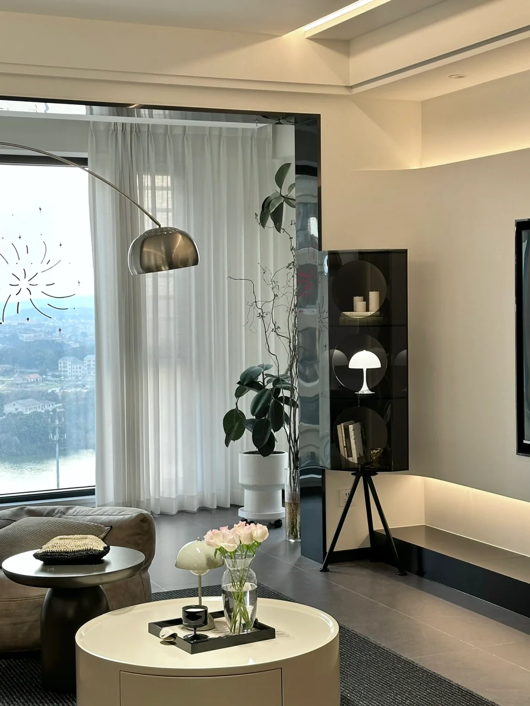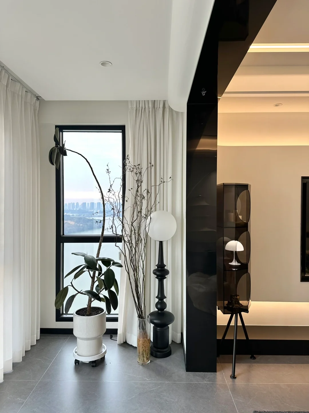 — 哈咯,欢迎☁️参观莫生气的家🏠 套内只有100㎡的房子,有三室两卫两阳台,被我们装修的很显大,除了打通阳台,连接客餐厅以外,还有一点就是用简单的色彩做软装搭配~ — 面积小就不能选择太复杂的硬装造型,避免视觉拥挤,我们浅色乳胶漆通刷墙顶以后,再搭配黑色软装提升质感,最近新入了一个greycube灰方的墙角边柜,亚克力的材质通透不沉闷,三角造型也很稳固,我这个弧形背景墙一下就换了一种风格👍🏻 — 装修没有💯答卷,软装也是常换常新~
