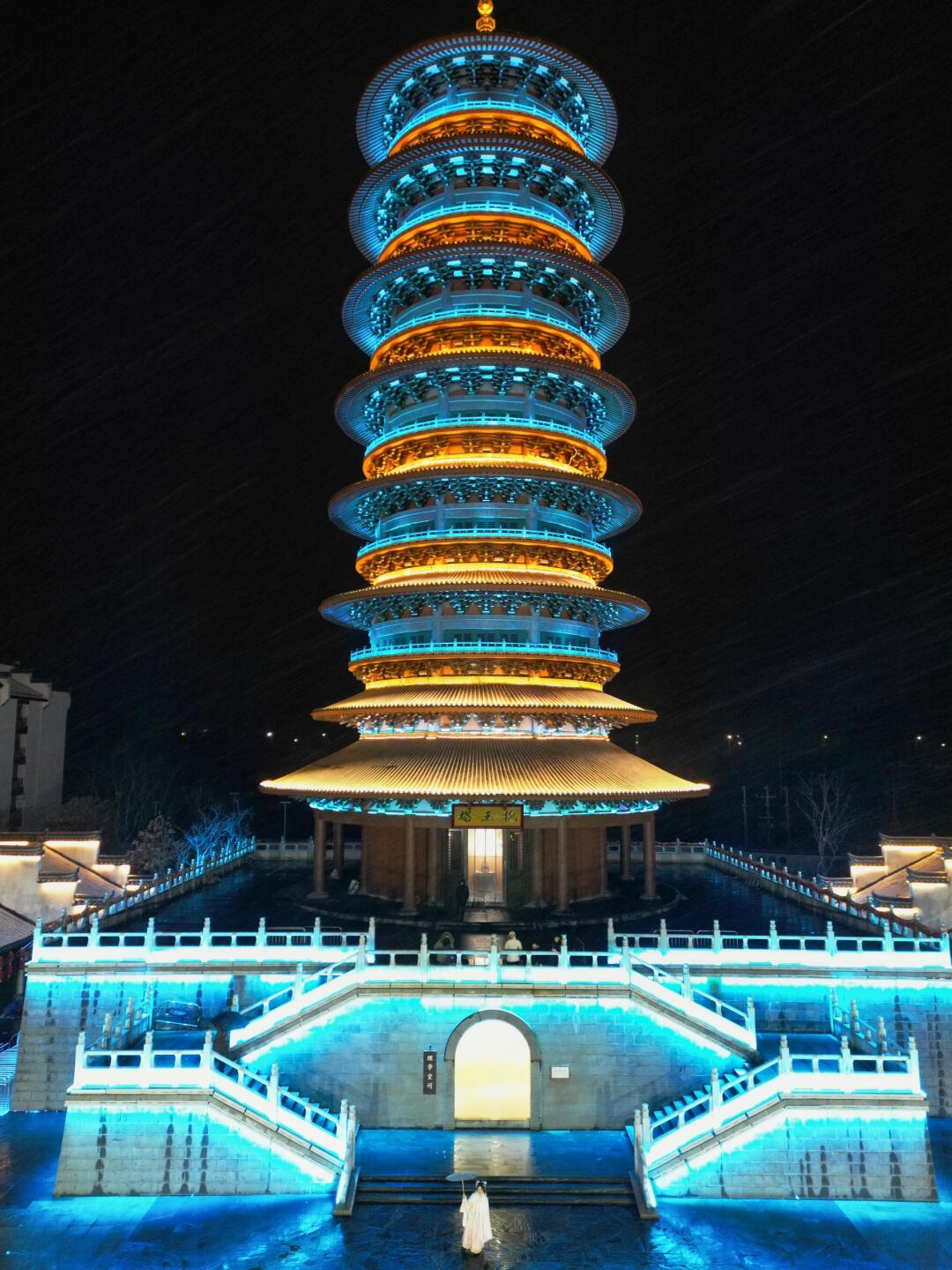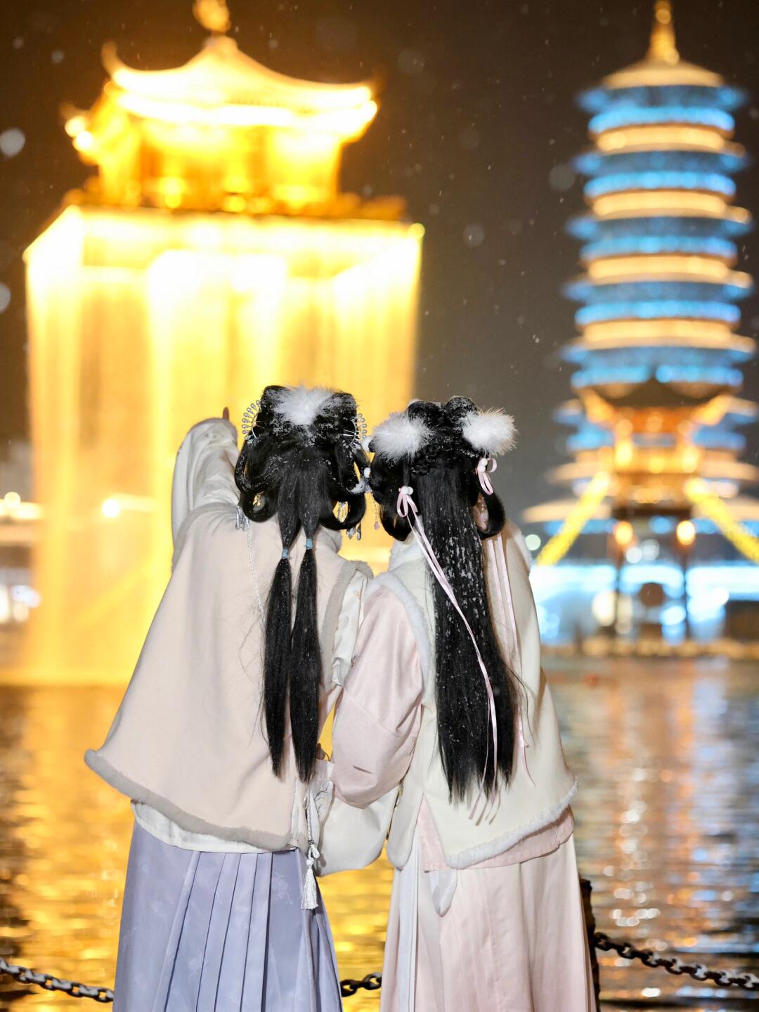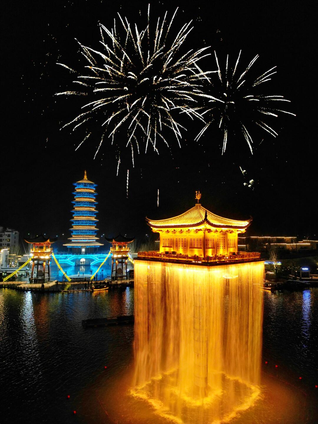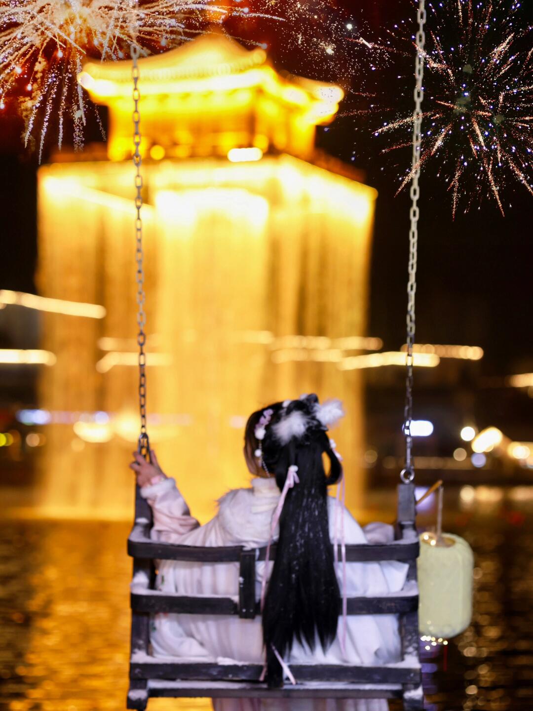 灯光秀在抱玉塔,日常每天都有。烟花秀在五显湖金阁附近,最佳观赏地推荐在秋千处