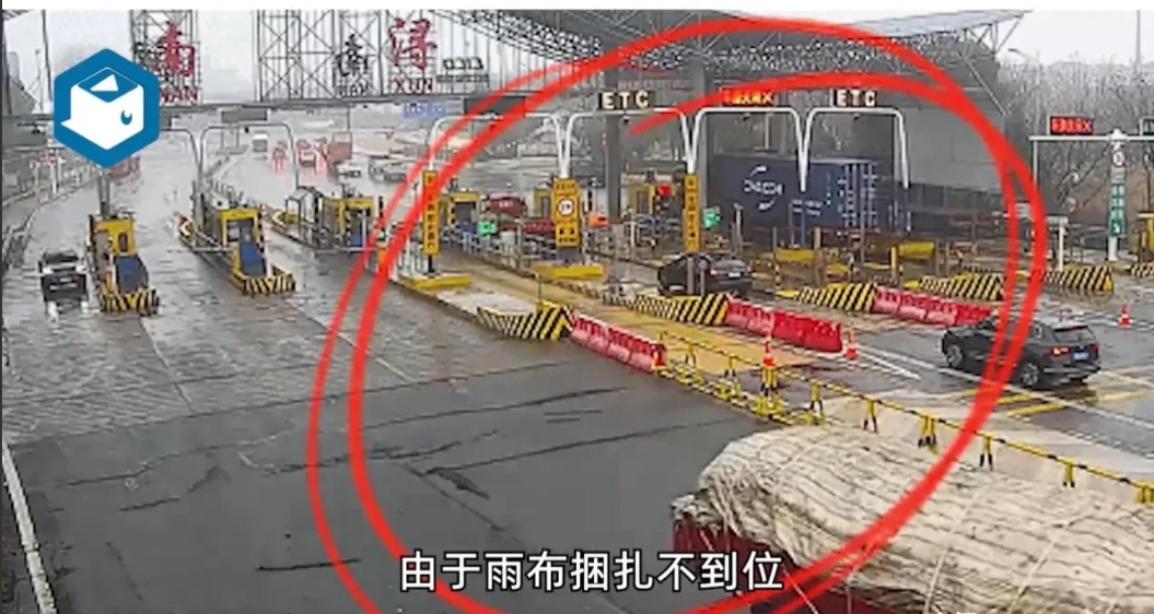 现场监控视频显示,一辆盖着白色雨布的货车,因雨布捆扎不到位,导致车上的银色片状铁皮从货车两侧不停掉落,且货车司机全然不知情。