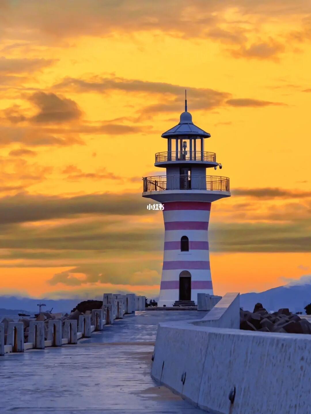 《消失的她》取景地,日出很美!不过不能走到灯塔下面,可以航拍或导航到“瀚海路”走到海边拍沙滩、海水和灯塔同框