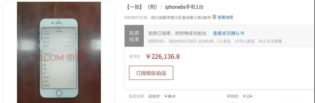 四川成都,某法院拍卖一部涉及刑事案件的旧iphone6s手机时,从86.8元起拍价,一路被抬价至22.6万卖出,且每次加价的幅度仅为50元,就有过万人,在不到一个小时内出价。拍卖公司回应称,交易系统一切正常,他们也不知道竞买人为什么这样做。