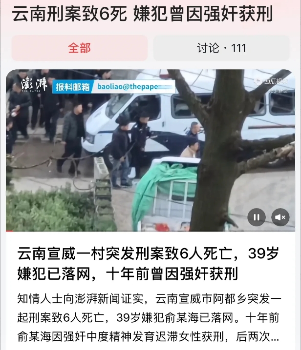 云南宣威,39岁男子先后杀害6人被当地警方通缉,并很快就被警方抓获归案。目前,警方已经证实被害人为两个成年人、四个小孩,且证实男子曾因强奸罪被判刑4年6个月,但两次获得减刑共计15个月。案件正在进一步侦办中。(来源:澎湃新闻)