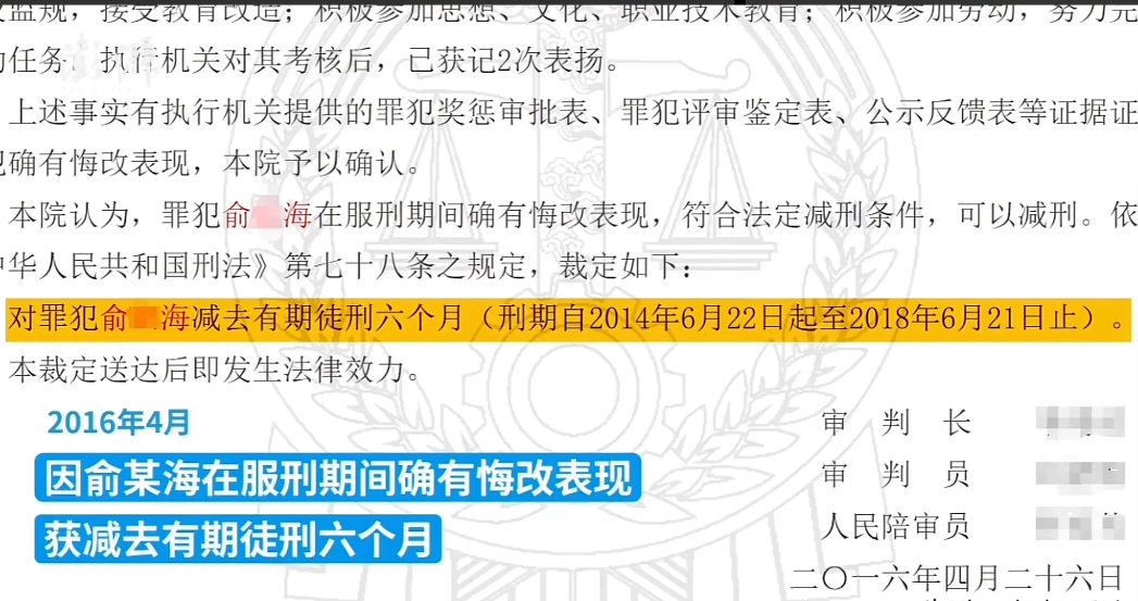 但是,俞某因在监狱表现良好,分别被减刑有期徒刑6个月和9个月,并于2017年9月21日刑满释放。