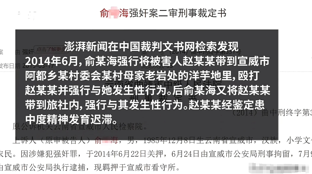 值得注意的是,公开资料显示,俞某在2014年6月时,曾将患中度精神发育迟滞的被害女子赵某带到田地对其殴打并对其实施侵犯,事后又将赵某带到旅社并再次对某实施侵犯。案发后法院判处俞某有期徒刑4年6个月,刑满释放日是2018年6月21日。