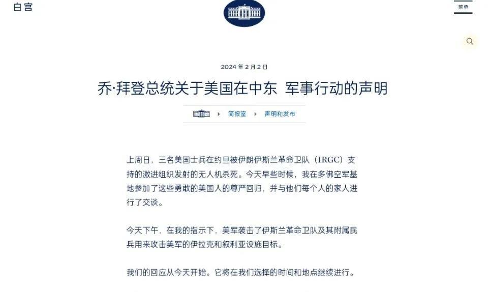 时隔5天,拜登终于就约旦基地美军人死亡事件——展开了报复性回击:发射125枚精确导弹