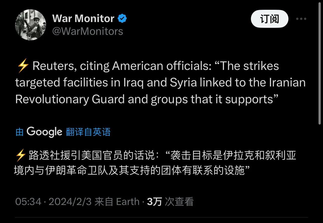 路透社援引美国官员的话说“袭击目标是伊拉克和叙利亚境内与伊朗革命卫队及其支持的团体有联系的设施。”