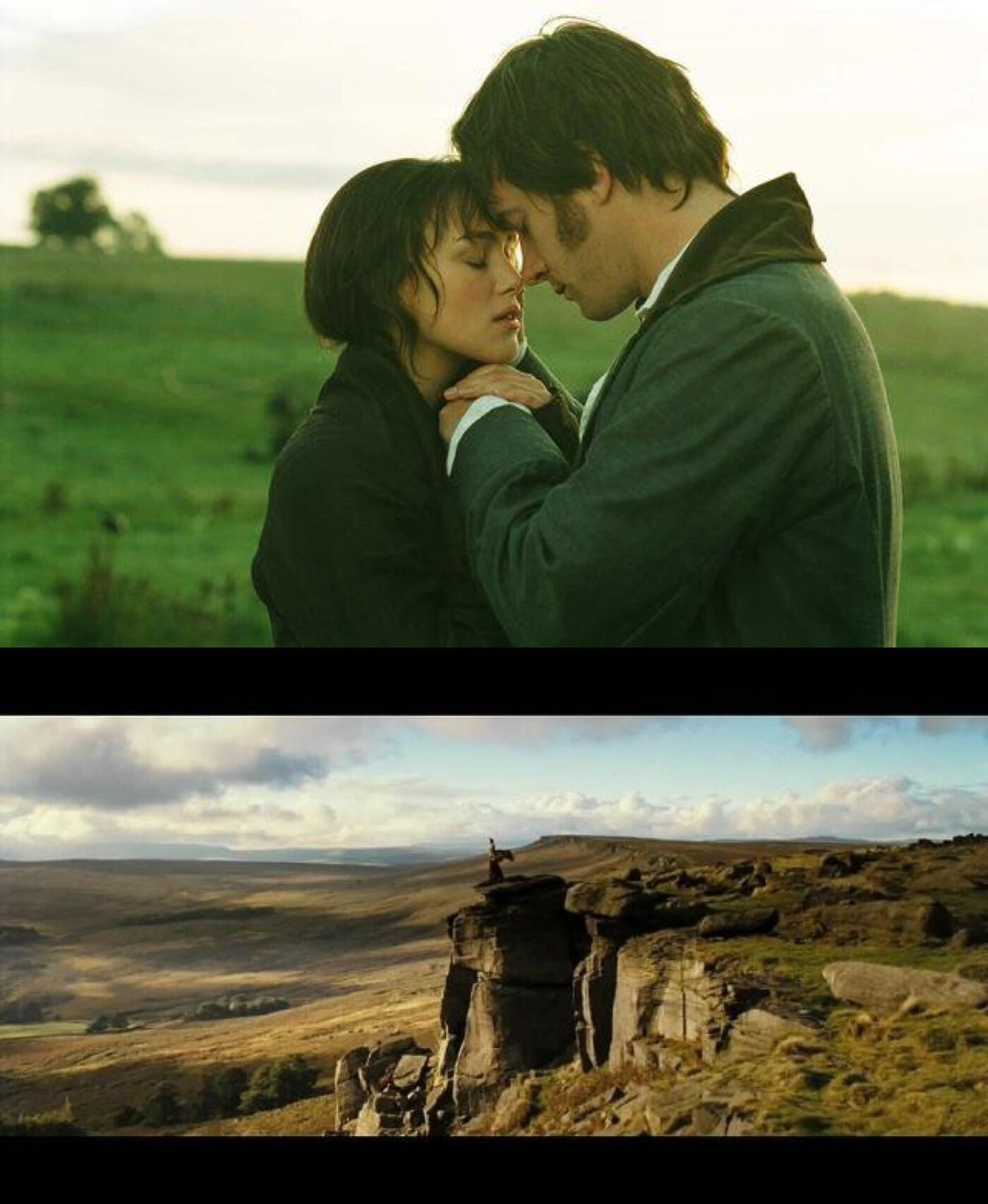 他们初次相遇于乡间舞会,而这舞会是为了迎接达西一行人而举办的,热烈欢快;还记得夏洛蒂家那阴暗的小房间,他急匆匆地闯入又仓皇离开,留下莫名其妙的她;还有那个下雨天,两人浑身湿透,他向她表白,却得到她毫不留情的拒绝和一通指责,雷声轰鸣雨水淅沥,一切都令人如此不安;还有那绝美的红褐色山谷,她站在最高耸的那块石头上,面朝一望无际的辽阔原野,头顶蓝天白云,任急促的山风吹起她的裙摆;那个太阳初升的微亮清晨,脚踝边的青草还沾有澄澈的露水,微凉的时节里有晨雾氤氲,她捧起他的手背亲吻,他抵着她的额头微笑。每一个情节都是一个动人的故事,每一个场景都是一幅美丽的画作