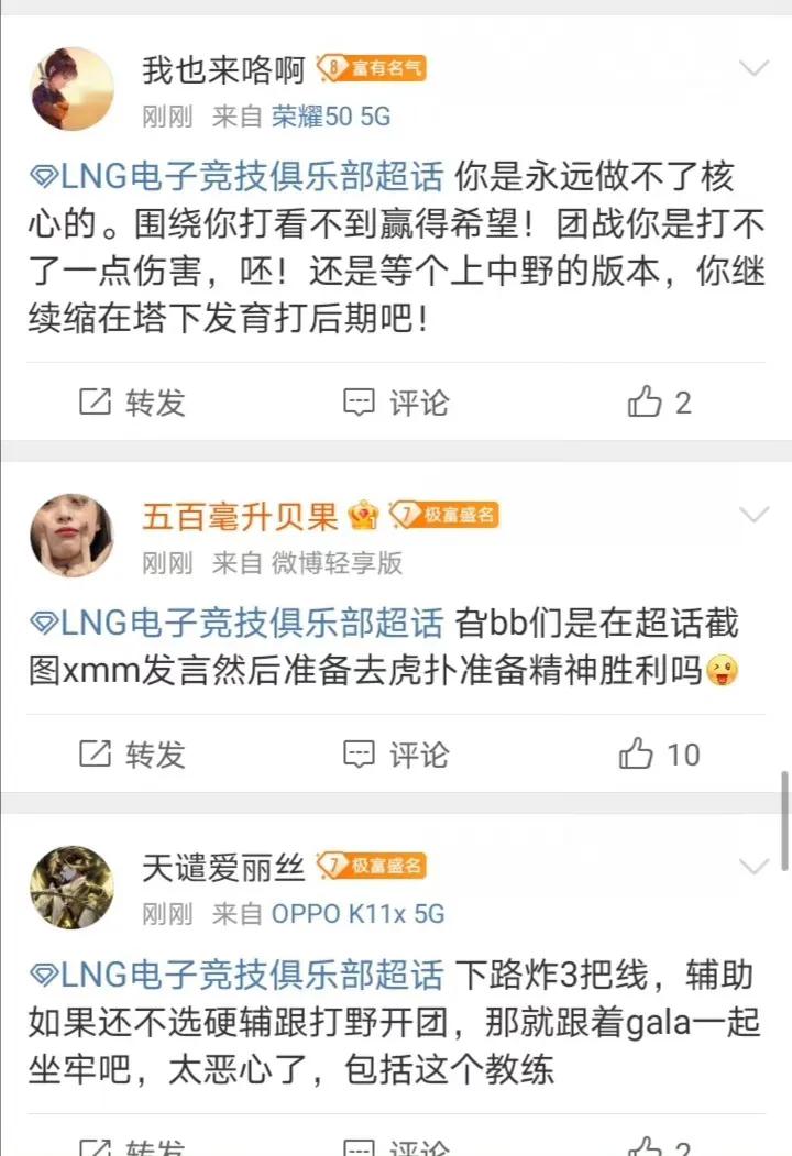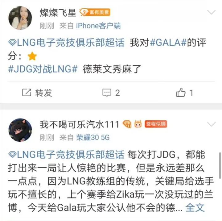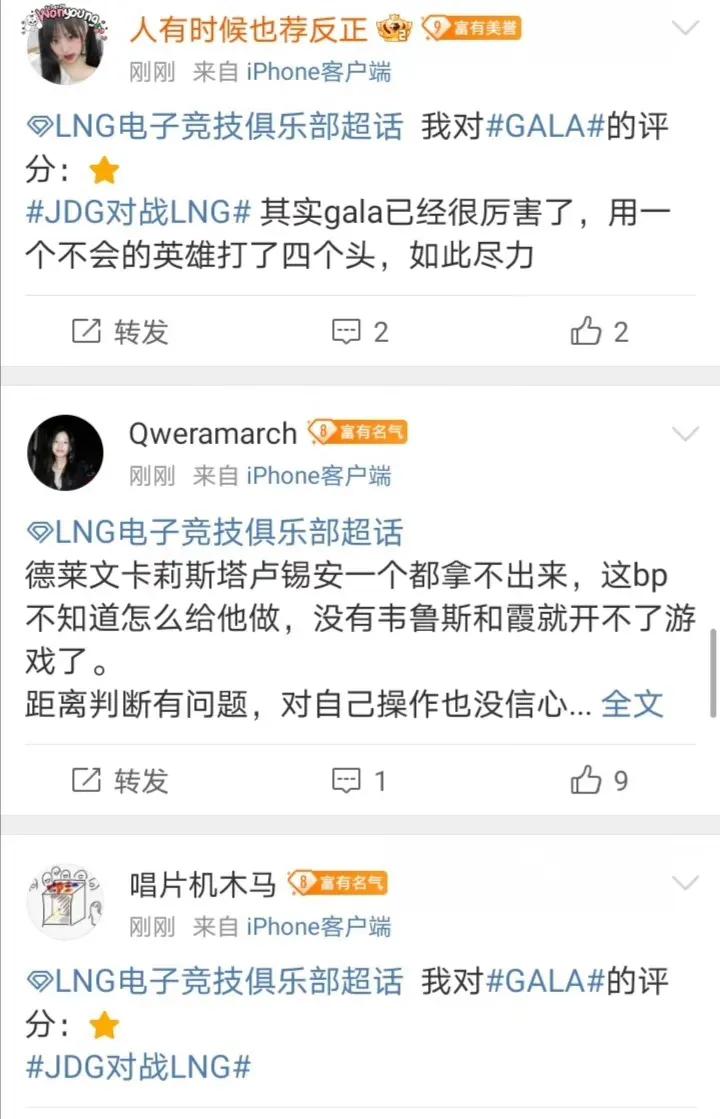 LNG超话疯狂清算Gala: 三年时间仅会玩三个英雄,连卢锡安都玩不明白[灵光一闪][灵光一闪][灵光一闪] 在昨天LNG被JDG让一追二击败后,Gala的低迷发挥成为了观众争议的焦点话题,而LNG超话更是热闹,在XMM(Scout女粉)的牵头带领之下,纷纷对Gala进行口诛笔伐,疯狂对其进行“清算” 有粉丝表示,Gala是近年来最被高估的国产AD选手,参加了三年世界赛,竟然仅仅会用三个英雄: 厄斐琉斯、卡莎、女枪,甚至还不如阿水的卢锡安,操作僵硬、毫无伤害 至于决胜局德莱文的选择更是令人诟病,众所周知Gala不会玩德莱文,为啥教练组还要让他选用呢?4-0天胡开局,然后打成那样,属实是闹麻了 #英雄联盟[超话]#