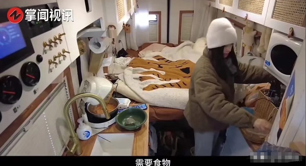 很快到了中午吃饭的时间,女生准备做饭。她的房车很暖和,有热水、有食物、还可以炒菜,而别人就可怜了,连一杯热水都是奢望!