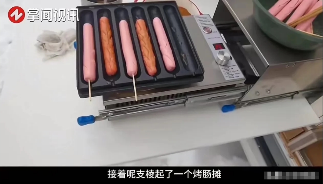 而这还没完,女生又把自己藏在冰箱里的烤肠拿出来,在车上支起了一个烤肠摊,免费分给没有食物的人吃!