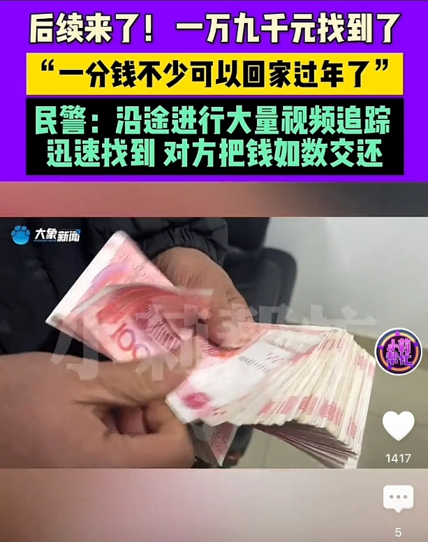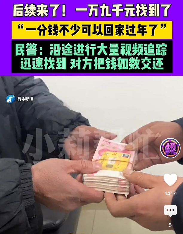 接到报案后,民警很快就找到了捡拾者,对方是一名未成年人,对方把这笔钱如数交给了民警,随后,民警将这笔钱交还给了师先生。