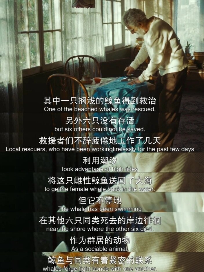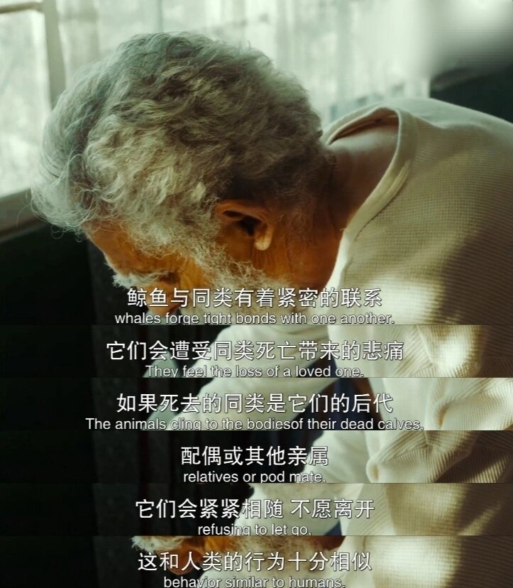 高压的社会环境里,反叛者的故事注定要被掩埋。这些本该被牢记的过去,正在逐渐地被遗忘,只剩下少数人还在背负。和海岸边搁浅的七条鲸鱼一样,存活下来的1只鲸鱼不断在6只同类死去的岸边徘徊。鲸鱼作为群居动物,与同类有着紧密的联系,它们会遭受着同类死亡带来的悲痛。如果死去的同类是它们的后代、朋友或者亲属,他们会紧紧跟随不愿离开,这和人类的行为十分相近。老人是这头幸存的鲸鱼🐳,死去的无名反抗者就是搁浅的鲸鱼。老人徘徊在死去的同胞身边,“世界已经逝去,而我承载你。”
