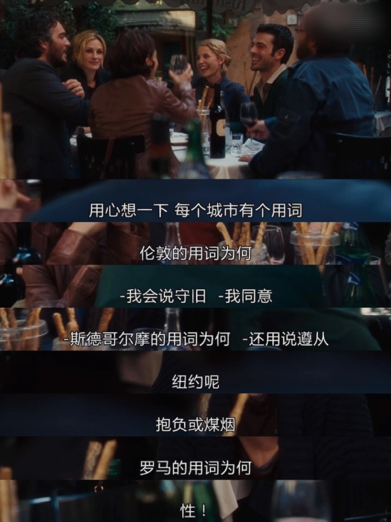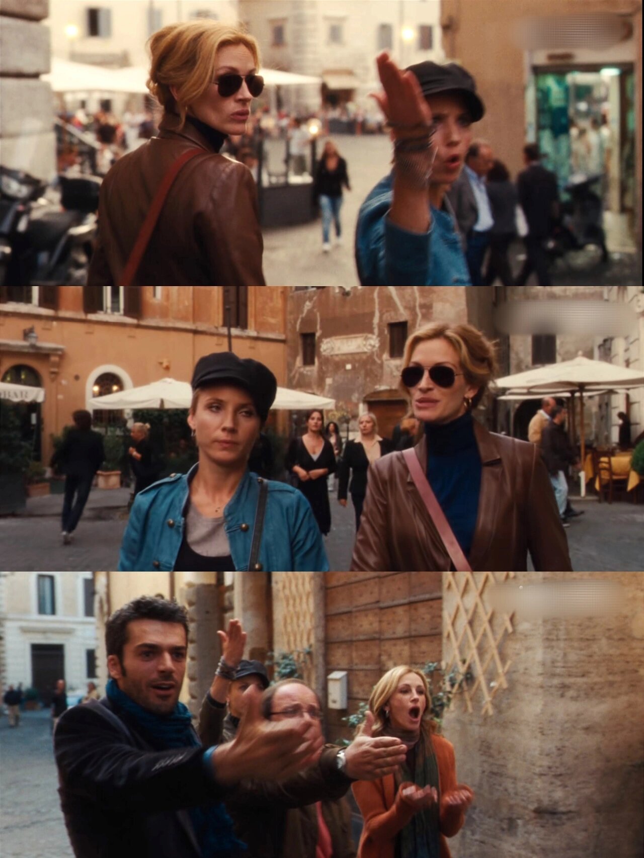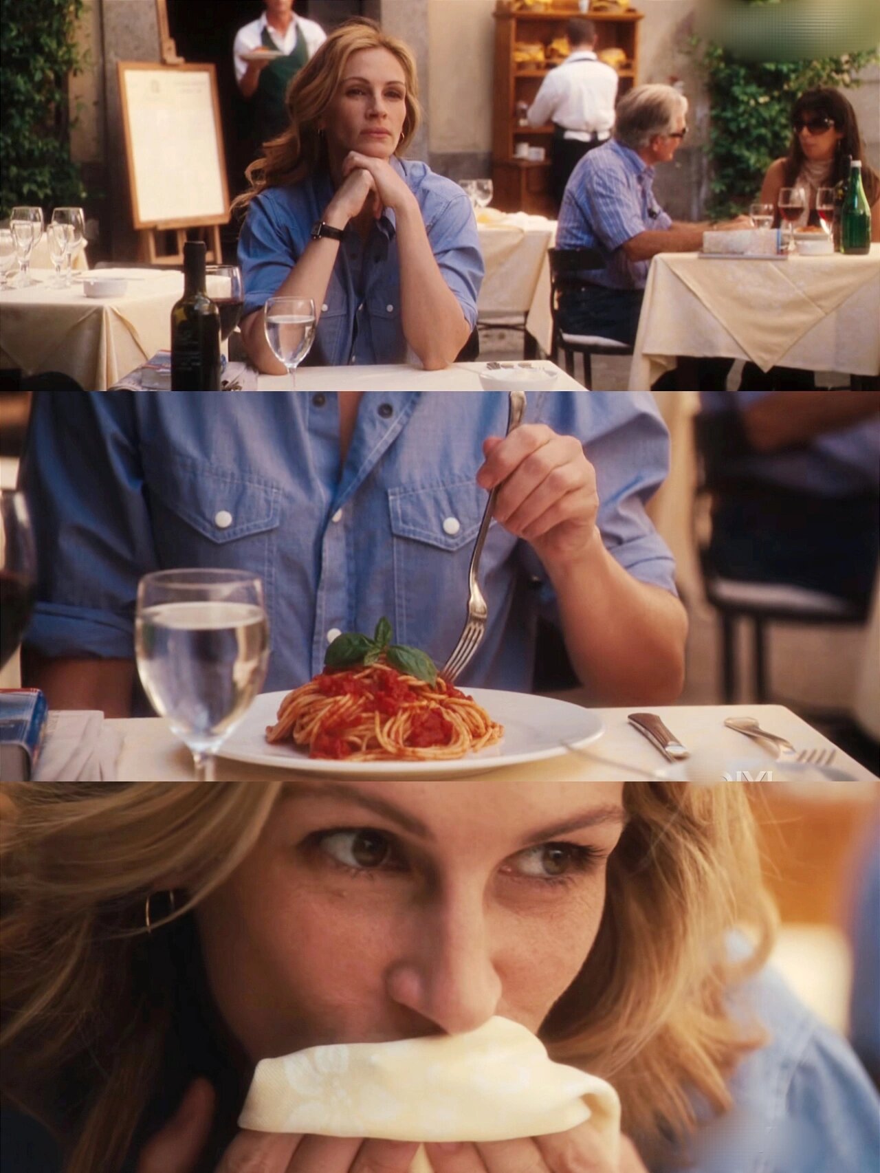 印度探索信仰,巴厘岛收获爱情,罗马则是找回自我之旅,伊丽莎白在罗马开始真正意识到“因为爱失去平衡,是人生平衡中最重要的一部分”。从15岁就开始不断的恋爱,分手,从未有过超过两星期独处的她,在罗马得到了空前的放松。