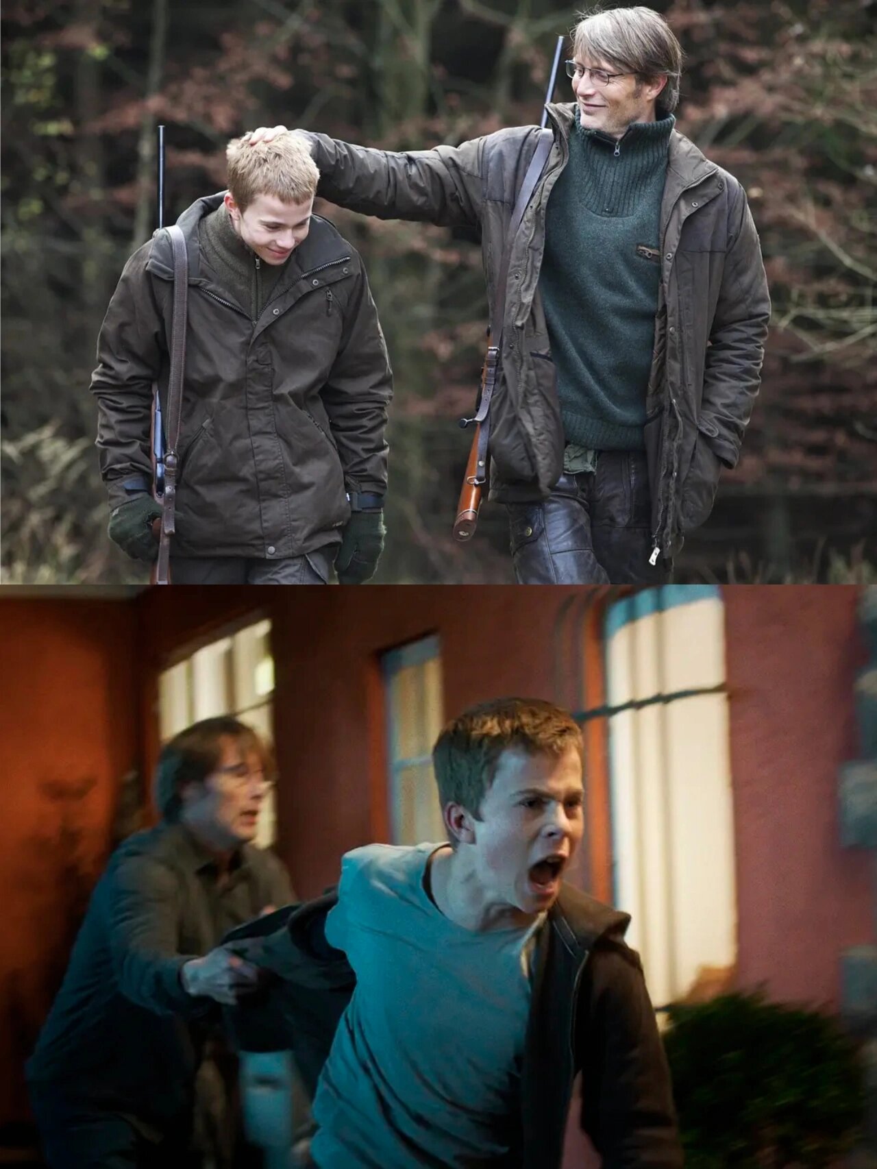 一年后,大家因为卢卡斯儿子的狩猎礼聚在一起,现场其乐融融,我以为时间终于消除了偏见,一声枪响却瞬间让我从虚假的温情中回归现实:卢卡斯在捕猎时被人朝头顶虚开了一枪,可回头时,地势和逆光让他无法辨认来人。谣言带来的伤害从来不会轻易揭过。
