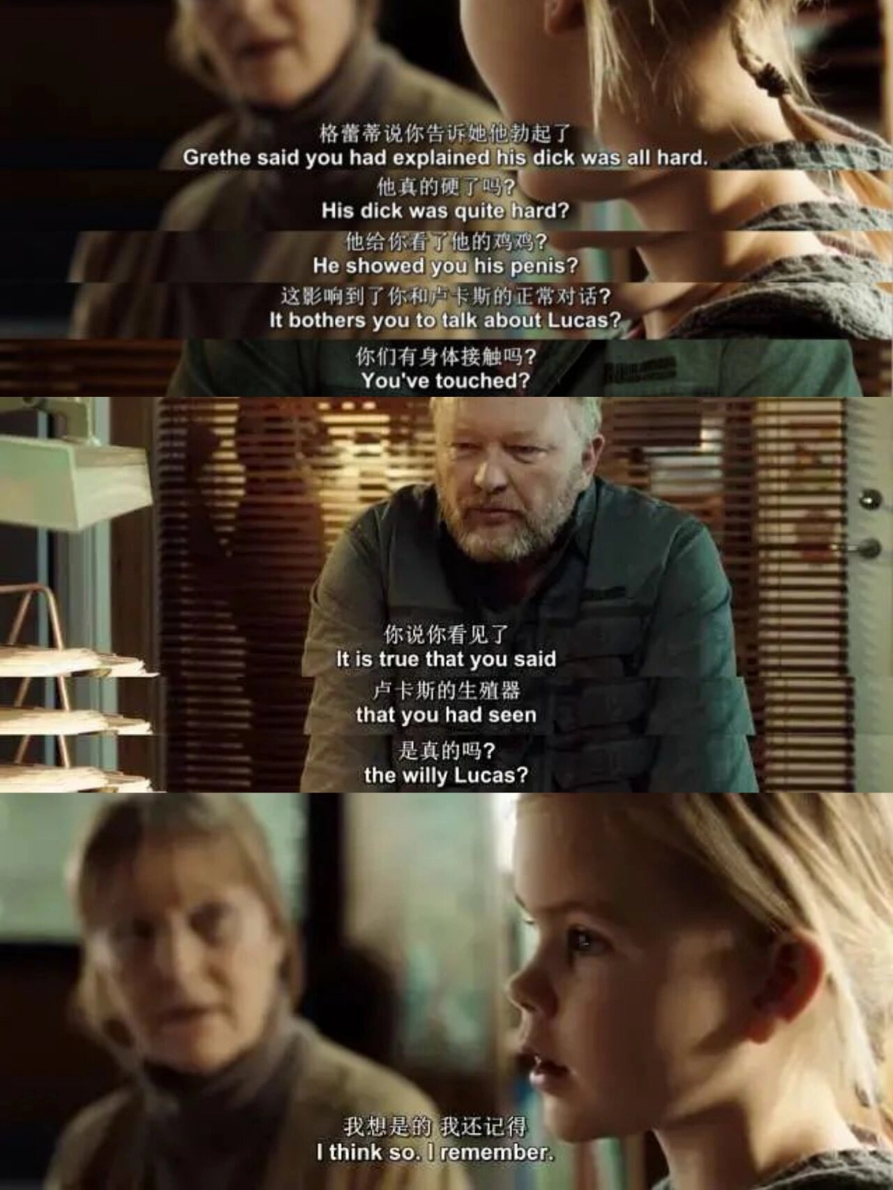 卡拉被年长的哥哥和同学玩闹时逼着看过男性私密处图片,那一番脱口而出的言论,真实到任谁听到都会警铃大响,而更让人心寒的是,昔日里和卢卡斯交好的其他孩子,也都纷纷指认他😭,他们甚至能描述出卢卡斯家里地下室的样子,可是真相是,他们家根本就没有地下室。