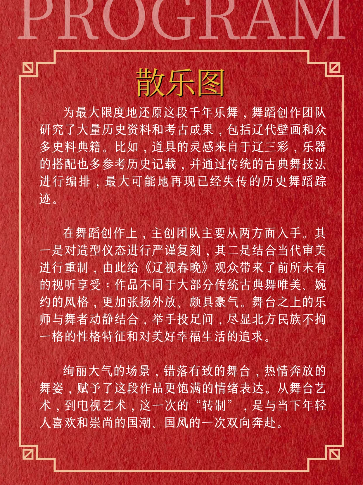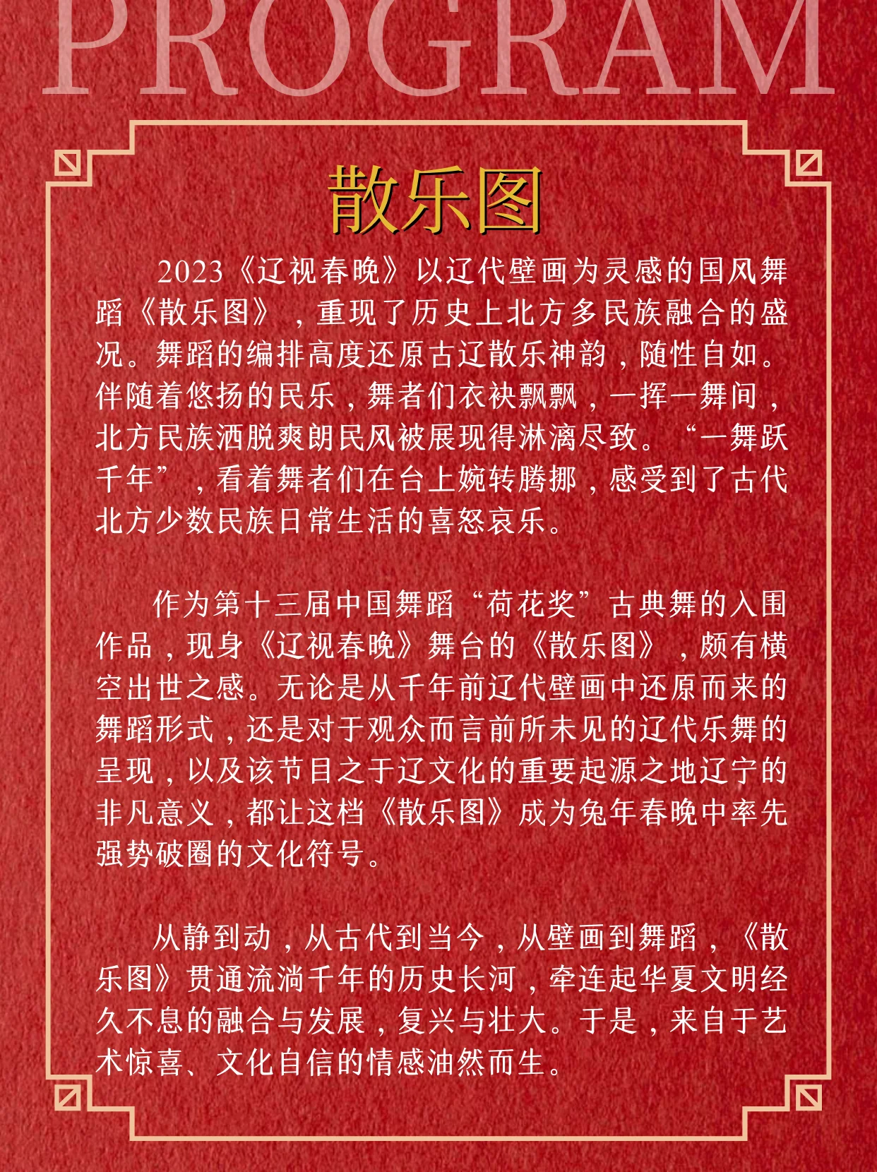 以辽代壁画为灵感的国风舞蹈《散乐图》,重现了历史上北方多民族融合的盛况。舞蹈的编排高度还原古辽散乐神韵,随性自如。伴随着悠扬的民乐,舞者们衣袂飘飘,一挥一舞间,北方民族洒脱爽朗民风被展现得淋漓尽致。“一舞跃千年”,看着舞者们在台上婉转腾挪,感受到了古代北方少数民族日常生活的喜怒哀乐。 作为第十三届中国舞蹈“荷花奖”古典舞的入围作品,现身舞台的《散乐图》,颇有横空出世之感。无论是从千年前辽代壁画中还原而来的舞蹈形式,还是对于观众而言前所未见的辽代乐舞的呈现,以及该节目之于辽文化的重要起源之地辽宁的非凡意义,都让这档《散乐图》成为兔年春晚中率先强势破圈的文化符号。 从静到动,从古代到当今,从壁画到舞蹈,《散乐图》贯通流淌千年的历史长河,牵连起华夏文明经久不息的融合与发展,复兴与壮大。于是,来自于艺术惊喜、文化自信的情感油然而生。 为最大限度地还原这段千年乐舞,舞蹈创作团队研究了大量历史资料和考古成果,包括辽代壁画和众多史料典籍。比如,道具的灵感来自于辽三彩,乐器的搭配也多参考历史记载,并通过传统的古典舞技法进行编排,最大可能地再现已经失传的历史舞蹈踪迹。 在舞蹈创作上,主创团队主要从两方面入手。其一是对造型仪态进行严谨复刻,其二是结合当代审美进行重制,由此给《辽视春晚》观众带来了前所未有的视听享受:作品不同于大部分传统古典舞唯美、婉约的风格,更加张扬外放、颇具豪气。舞台之上的乐师与舞者动静结合,举手投足间,尽显北方民族不拘一格的性格特征和对美好幸福生活的追求。 绚丽大气的场景,错落有致的舞台,热情奔放的舞姿,赋予了这段作品更饱满的情绪表达。从舞台艺术,到电视艺术,这一次的“转制”,是与当下年轻人喜欢和崇尚的国潮、国风的一次双向奔赴。