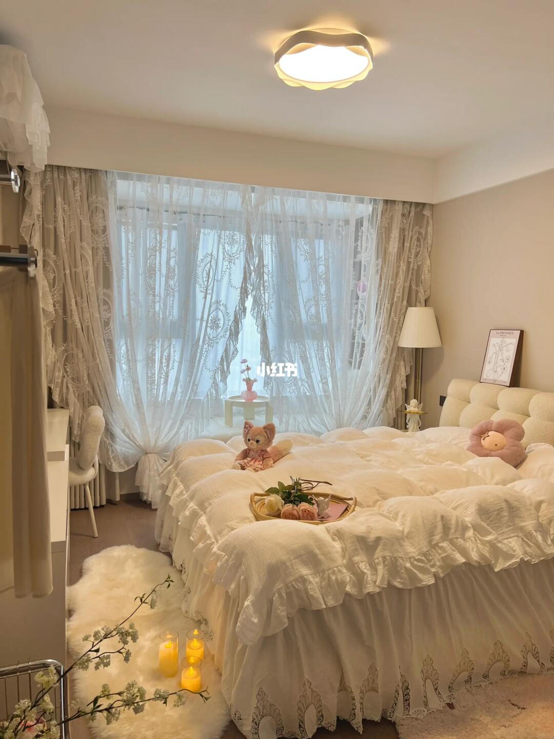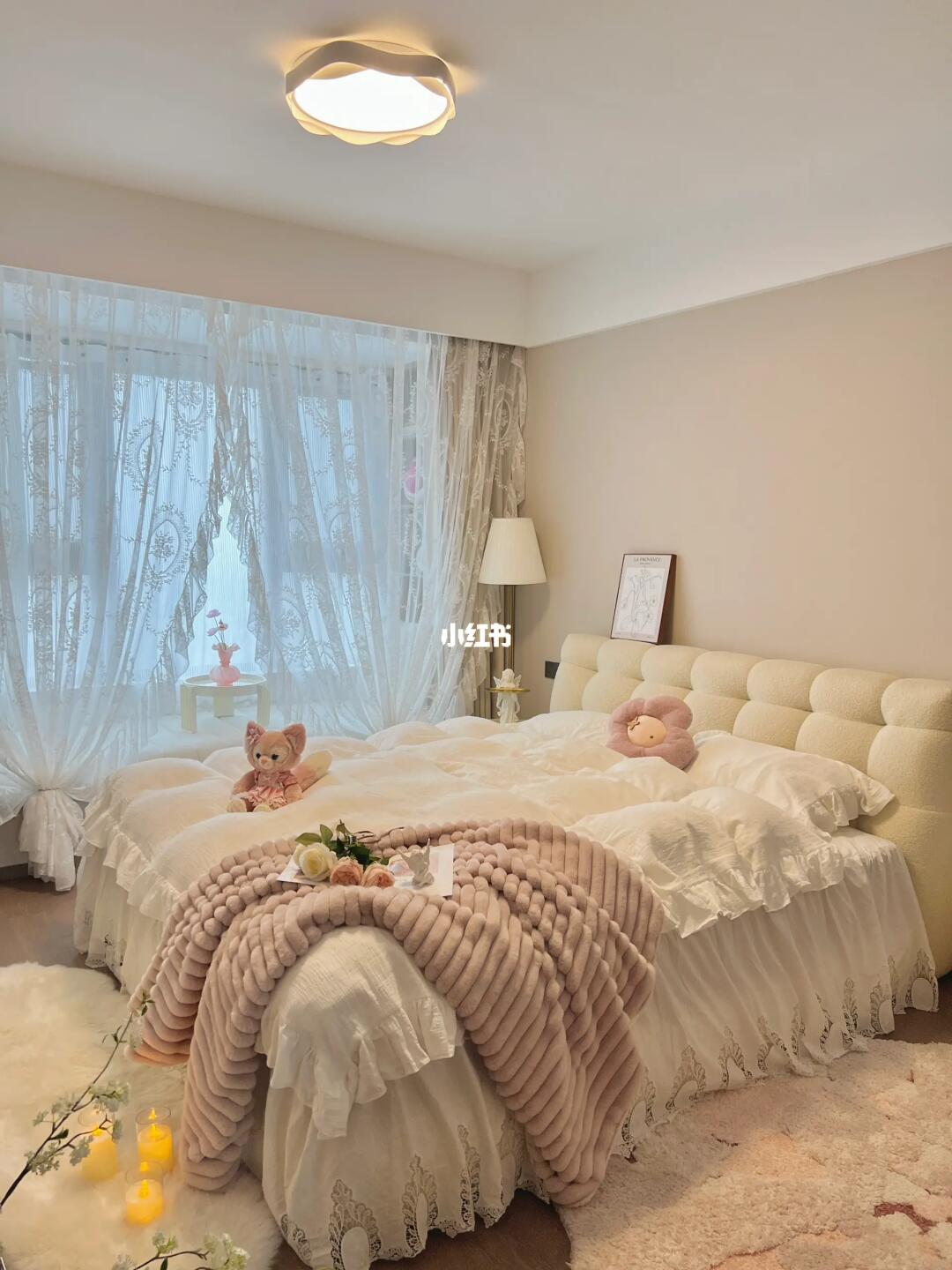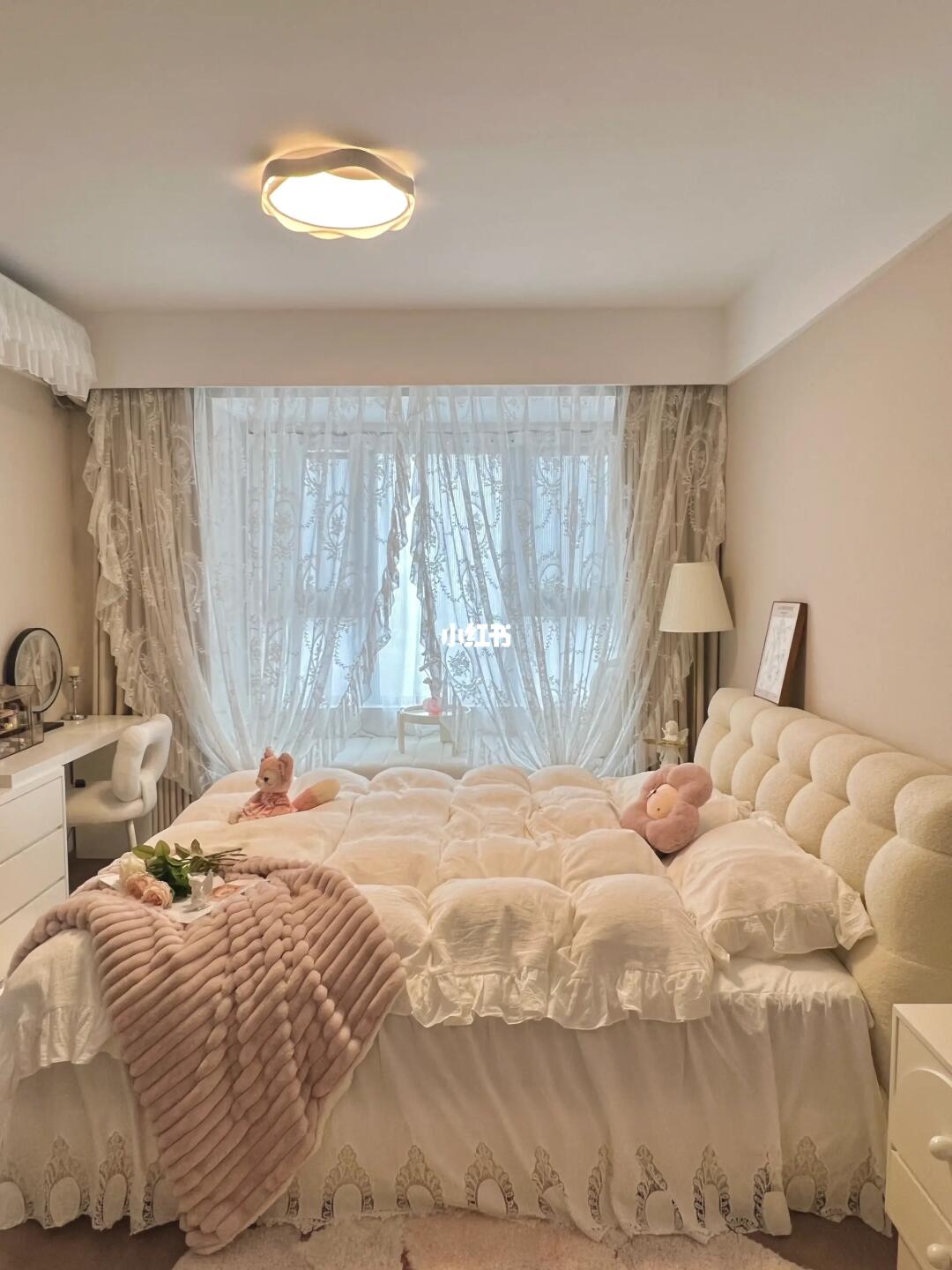 当初没有请设计师,全靠自己设计和装修,老公也没插手,看到装修好的卧室,他直呼我是不是有超能力?不然怎么能把卧室装得这么好看🤣 · 软软的棉花糖床搭配法式四件套,房间都变温柔啦🌷配上奶油花边吸顶灯,奶呼呼的温柔又浪漫💕冬日暖阳洒在飘窗垫上☀️太舒服啦~ · 其实,卧室不需要多复杂的装饰,简简单单清清爽爽的就足够啦~