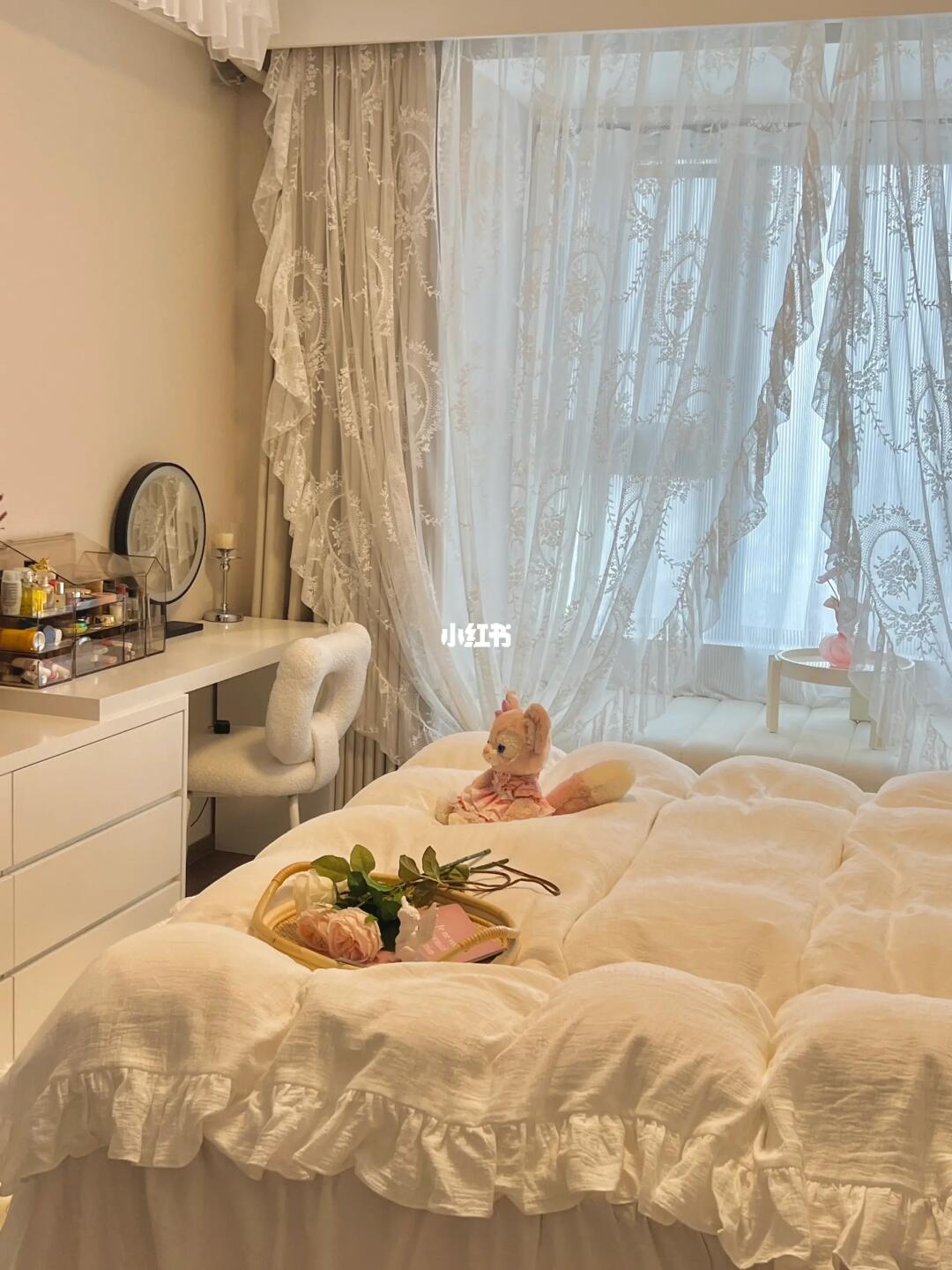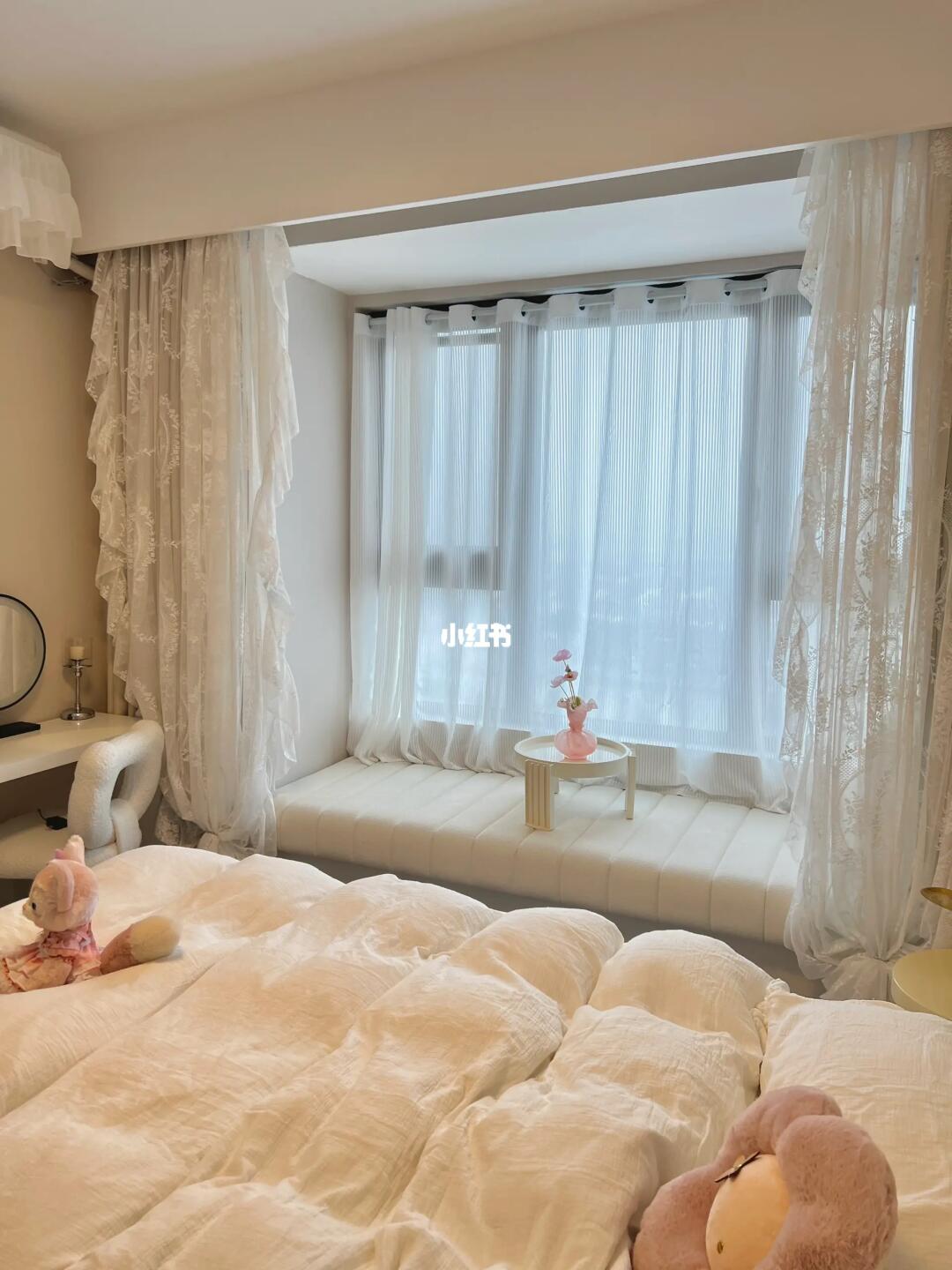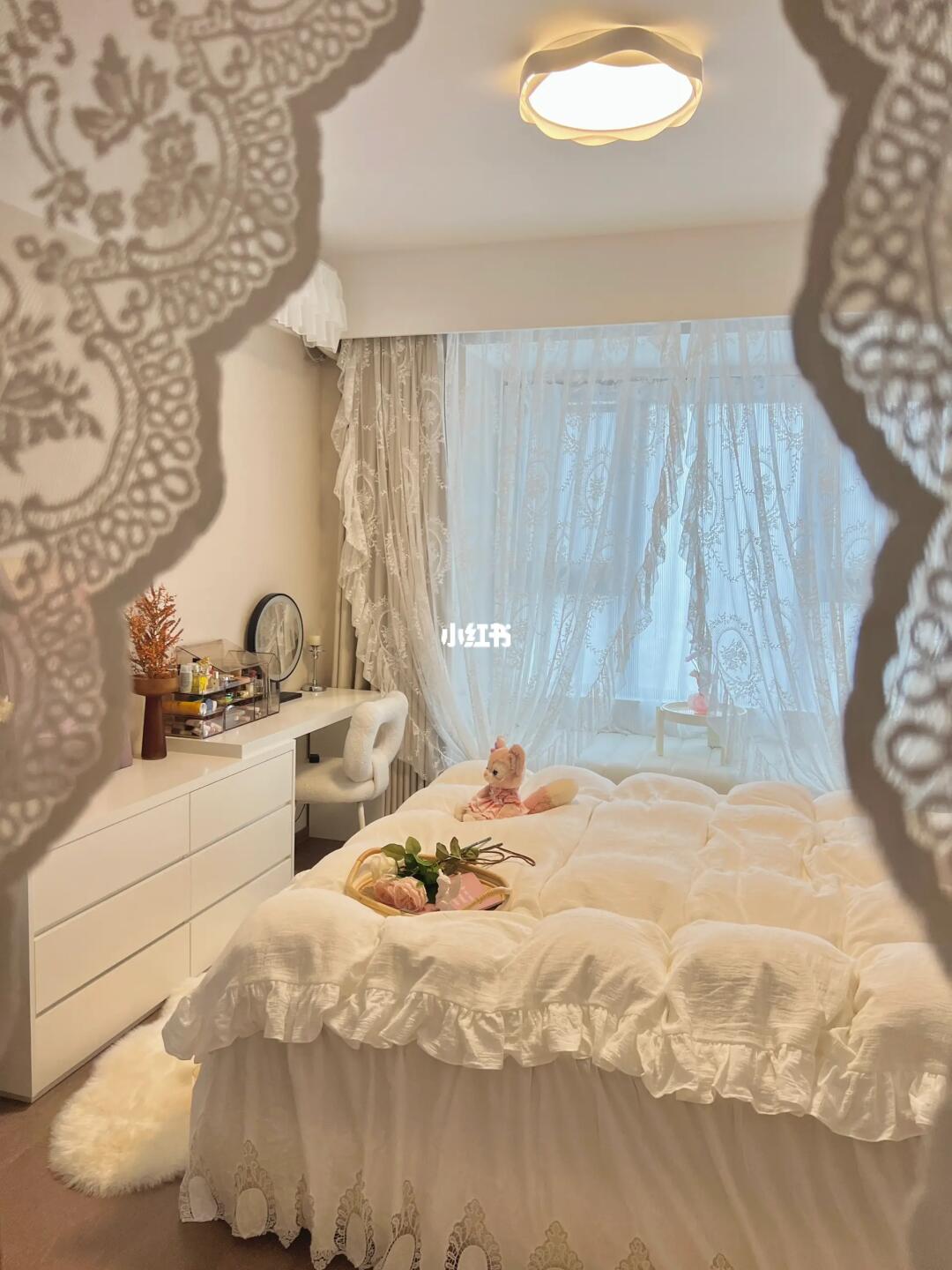 当初没有请设计师,全靠自己设计和装修,老公也没插手,看到装修好的卧室,他直呼我是不是有超能力?不然怎么能把卧室装得这么好看🤣 · 软软的棉花糖床搭配法式四件套,房间都变温柔啦🌷配上奶油花边吸顶灯,奶呼呼的温柔又浪漫💕冬日暖阳洒在飘窗垫上☀️太舒服啦~ · 其实,卧室不需要多复杂的装饰,简简单单清清爽爽的就足够啦~