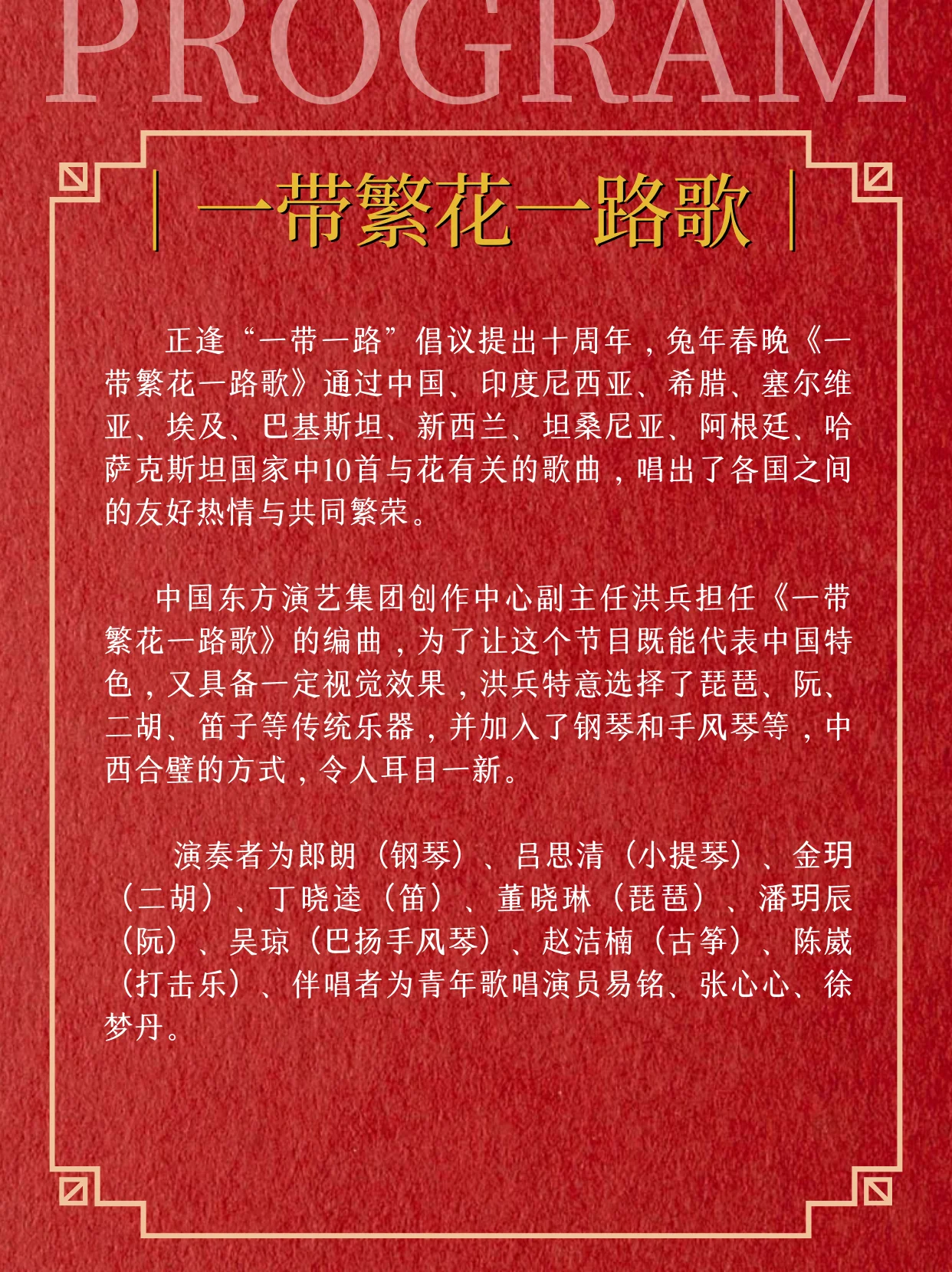 正逢“一带一路”倡议提出十周年,春晚《一带繁花一路歌》通过中国、印度尼西亚、希腊、塞尔维亚、埃及、巴基斯坦、新西兰、坦桑尼亚、阿根廷、哈萨克斯坦国家中10首与花有关的歌曲,唱出了各国之间的友好热情与共同繁荣。