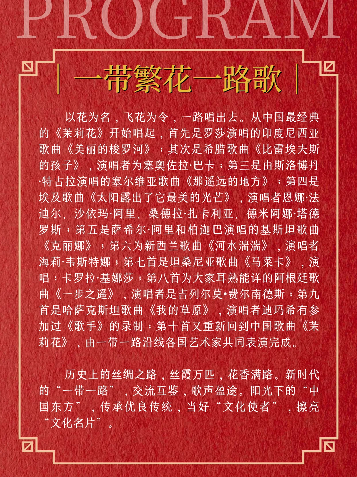 以花为名,飞花为令,一路唱出去。从中国最经典的《茉莉花》开始唱起,首先是罗莎演唱的印度尼西亚歌曲《美丽的梭罗河》;其次是希腊歌曲《比雷埃夫斯的孩子》,演唱者为塞奥佐拉·巴卡;第三是由斯洛博丹·特古拉演唱的塞尔维亚歌曲《那遥远的地方》;第四是埃及歌曲《太阳露出了它最美的光芒》,演唱者恩娜·法迪尔、沙依玛·阿里、桑德拉·扎卡利亚、德米阿娜·塔德罗斯;第五是萨希尔·阿里和柏迦巴演唱的基斯坦歌曲《克丽娜》;第六为新西兰歌曲《河水湍湍》,演唱者海莉·韦斯特娜;第七首是坦桑尼亚歌曲《马菜卡》,演唱:卡罗拉·基娜莎;第八首为大家耳熟能详的阿根廷歌曲《一步之遥》,演唱者是吉列尔莫•费尔南德斯;第九首是哈萨克斯坦歌曲《我的草原》,演唱者迪玛希有参加过《歌手》的录制;第十首又重新回到中国歌曲《茉莉花》,由一带一路沿线各国艺术家共同表演完成。